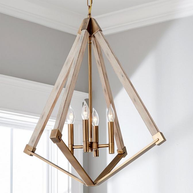 The inverted diamond silhouette, bold lines, and vintage finishes of this fixture merge for the perfect eclectic look! The faux wood metal frame in distressed ivory is perfectly accented by the soft brass caps and center column.