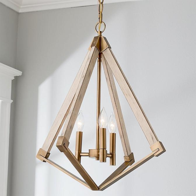 The inverted diamond silhouette, bold lines, and vintage finishes of this fixture merge for the perfect eclectic look! The faux wood metal frame in distressed ivory is perfectly accented by the soft brass caps and center column.