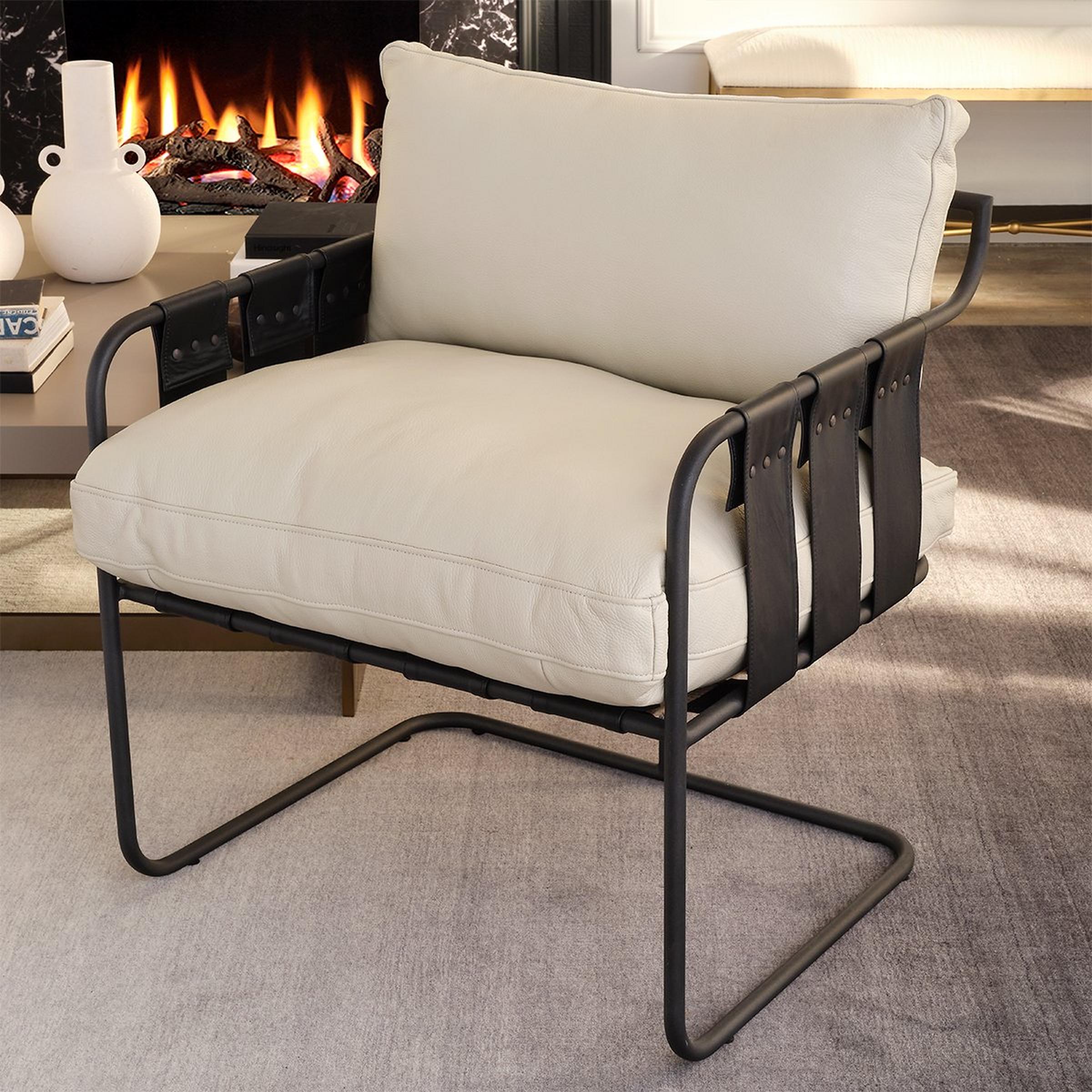 The Diego Accent Chair is designed to stand out, featuring high-quality, supple top-grain leather and a sturdy iron base. This chair seamlessly blends industrial strength with plush elegance. Its unique strapped seating not only catches the eye but also provides exceptional comfort, making it a must-have centerpiece for any modern space.
