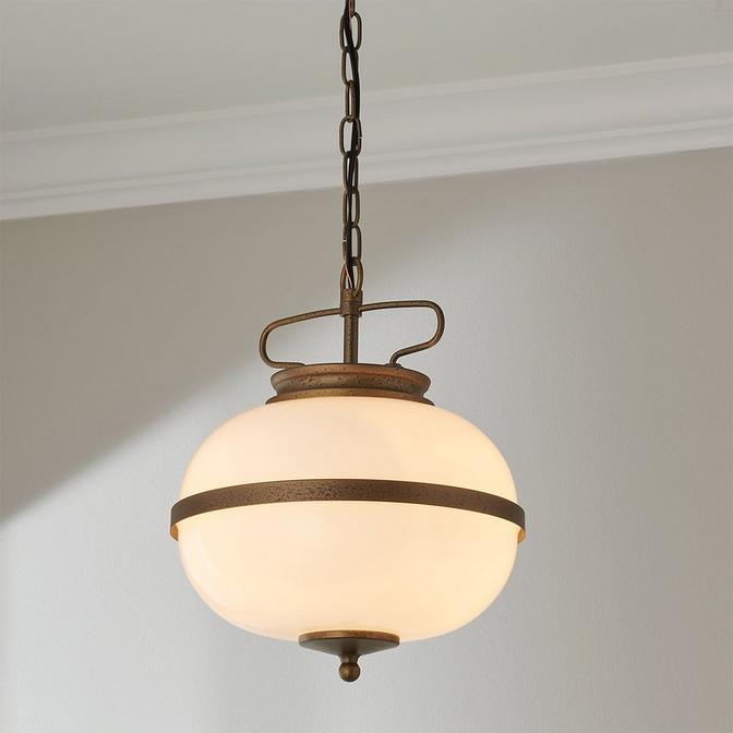 This pendant adds a touch of old-world charm to any room with its ornamental metal details and gracefully rustic chain. The opal glass shade is a striking complement to the timelessly sophisticated design.