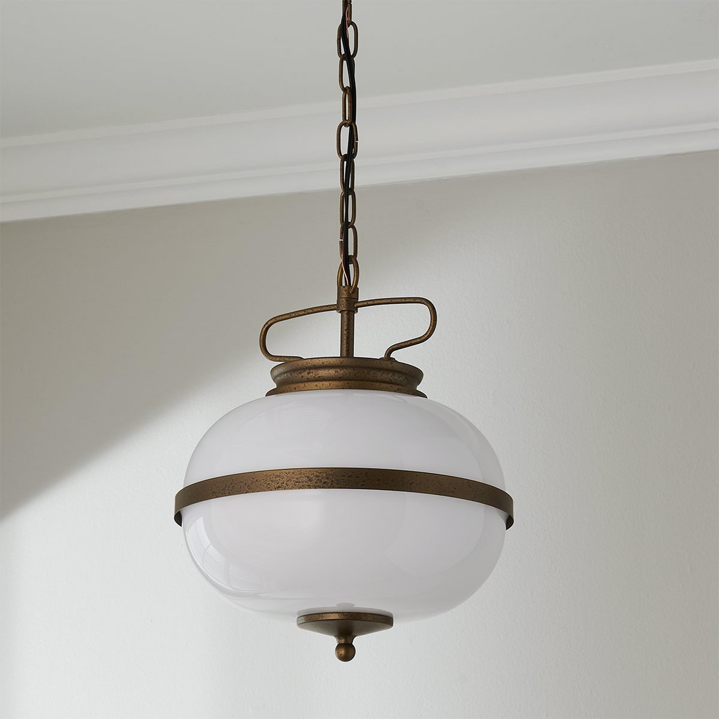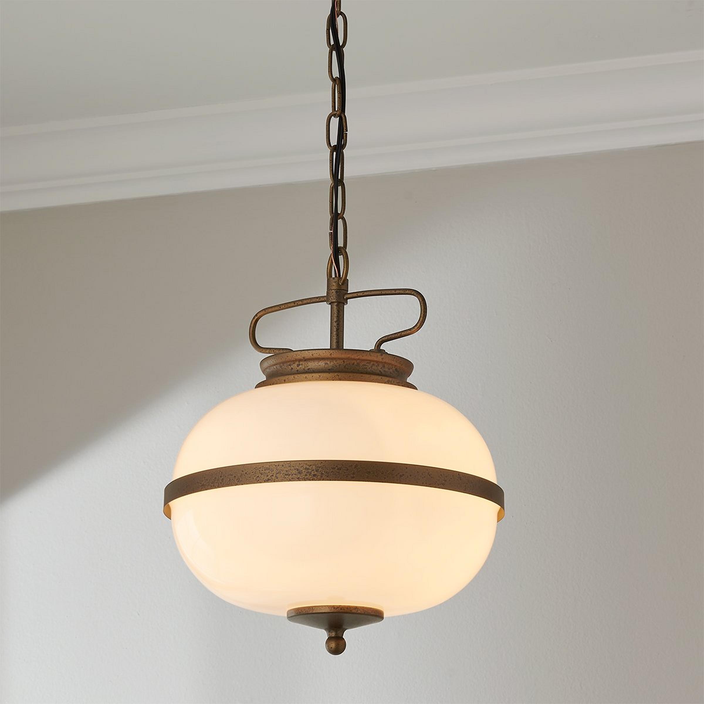 This pendant adds a touch of old-world charm to any room with its ornamental metal details and gracefully rustic chain. The opal glass shade is a striking complement to the timelessly sophisticated design.