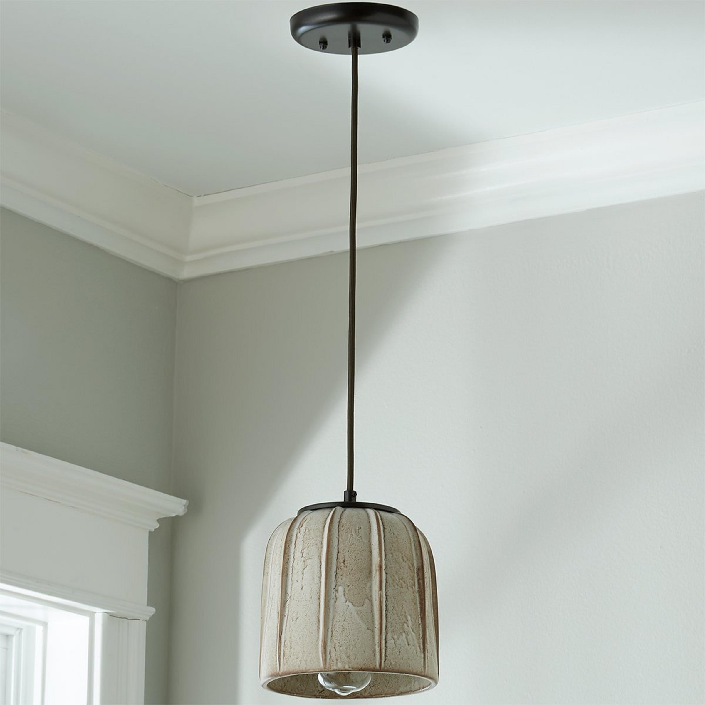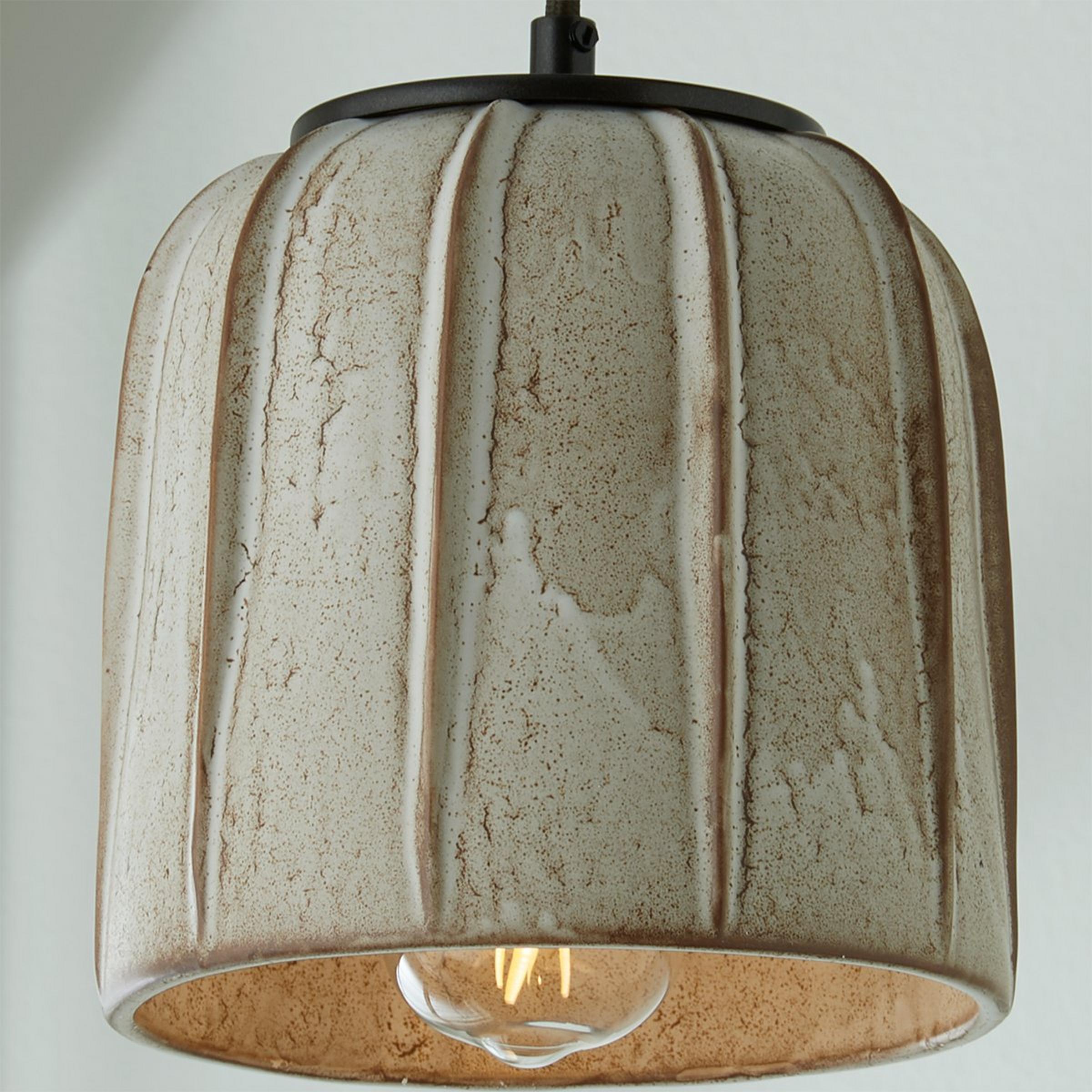 A fun take on a classic, this sculptural, distressed ivory colored ceramic pot is a fun, modern way to add some texture to any modern kitchen or over a small table. Due to the nature of this pottery glaze, no two will be exactly alike in color or pattern. This pendant is assembled by hand in our Richmond, Virginia production facility.