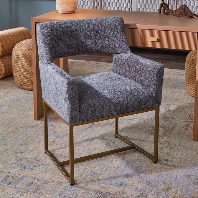 The Domenikos Dining Chair offers a fresh take on Scandinavian design. Upholstered in plush fabric for comfort and sits atop a powder-coated steel base with a rustic bronze finish.
