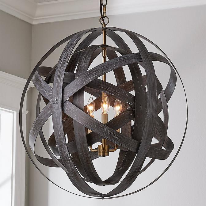 Two metal strap globes nest inside one another in this modern industrial inspired lantern. Aged iron finished straps can be adjusted individually to your desired design. Illuminated within from a 3 light cluster, the sphere glows with sleek "salvage" appeal.