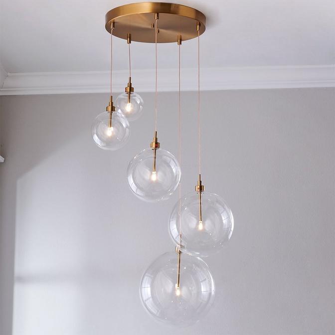 This dreamy globe chandelier adds a touch of creativity and intrigue by dangling hand-blown glass globes at varying heights. Each orb can be raised or lowered independently to unleash creativity and make your space unique. The central thought-provoking dots of light function like sparks of brilliance hanging above. Bi-Pin T4 LED bulb included.