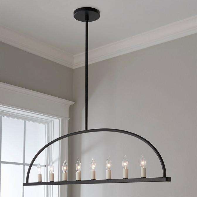This gorgeously minimalist linear chandelier makes a big impact with a stunningly simple design, featuring a single line of candle lamps set within a half-moon frame.