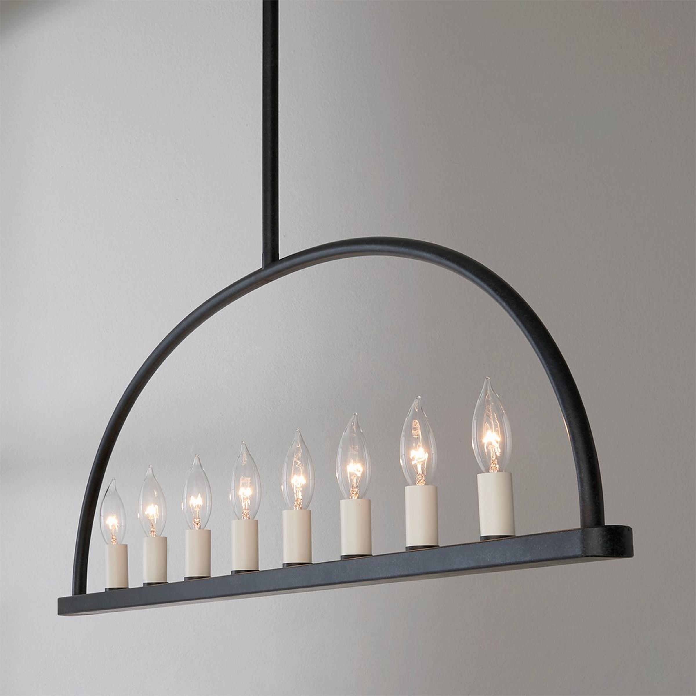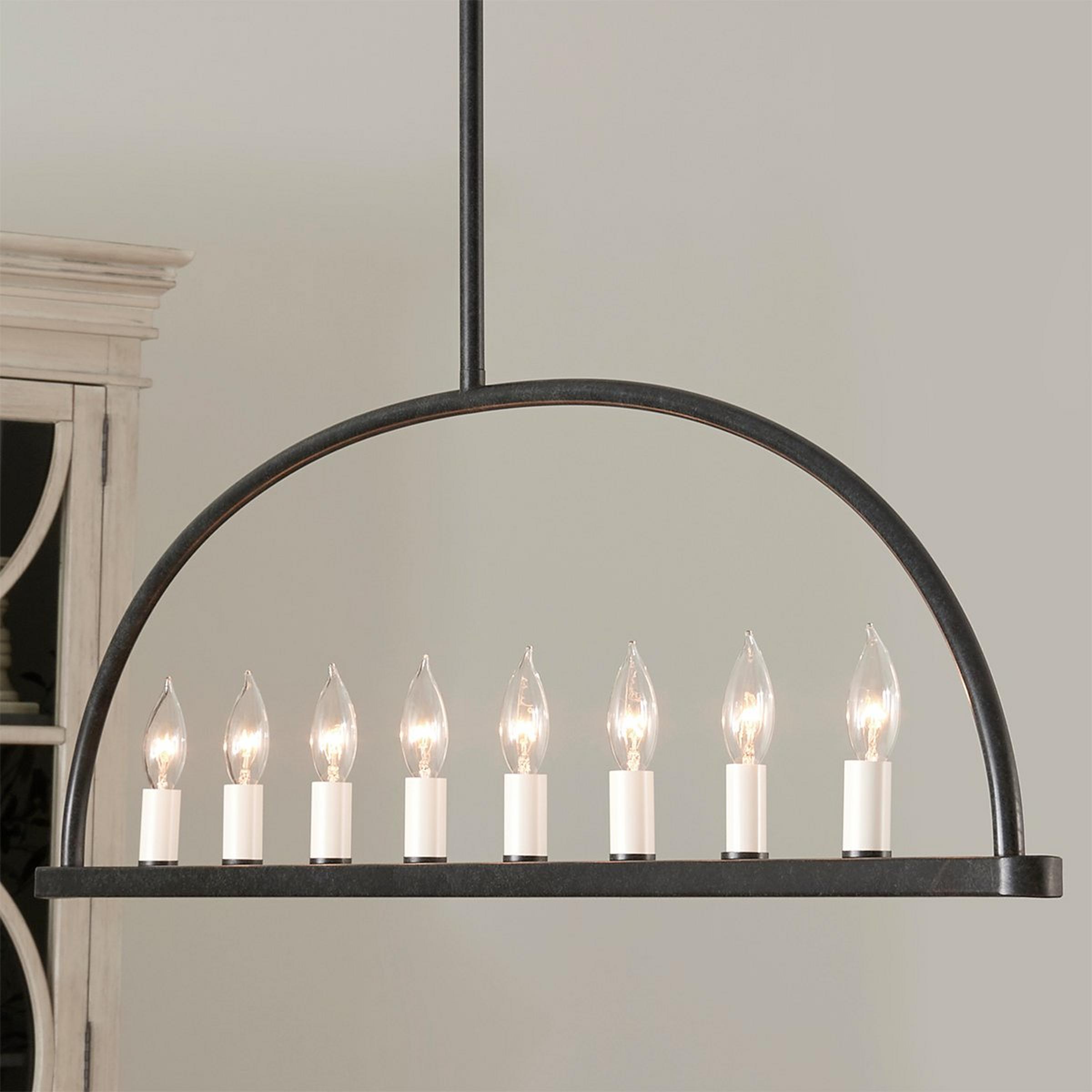 This gorgeously minimalist linear chandelier makes a big impact with a stunningly simple design, featuring a single line of candle lamps set within a half-moon frame.