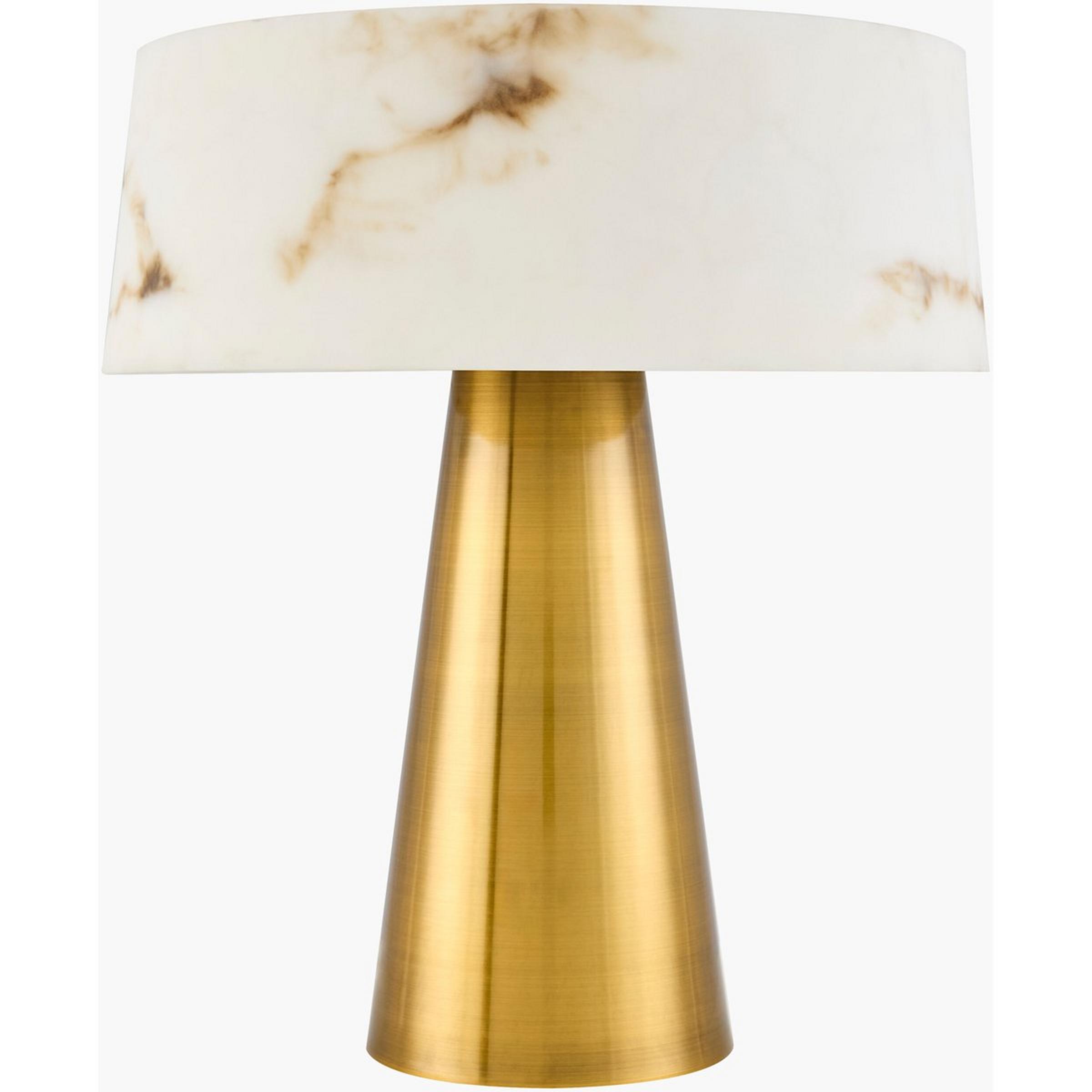 This table lamp is both innovative and unique, reimaging classic silhouettes with premium materials and flair. Its simple shape allows the luxurious materials to take center stage! With its tapered gilded base that leads into its stone shade, this light adds a stunning glow to your space. Celebrate the natural fluctuations in hues and patterns of veining that make each stone shade unique. Perfect for elevating your side table or adding a touch of glamour to a nightstand, this lamp adds a subtle illumination with style.