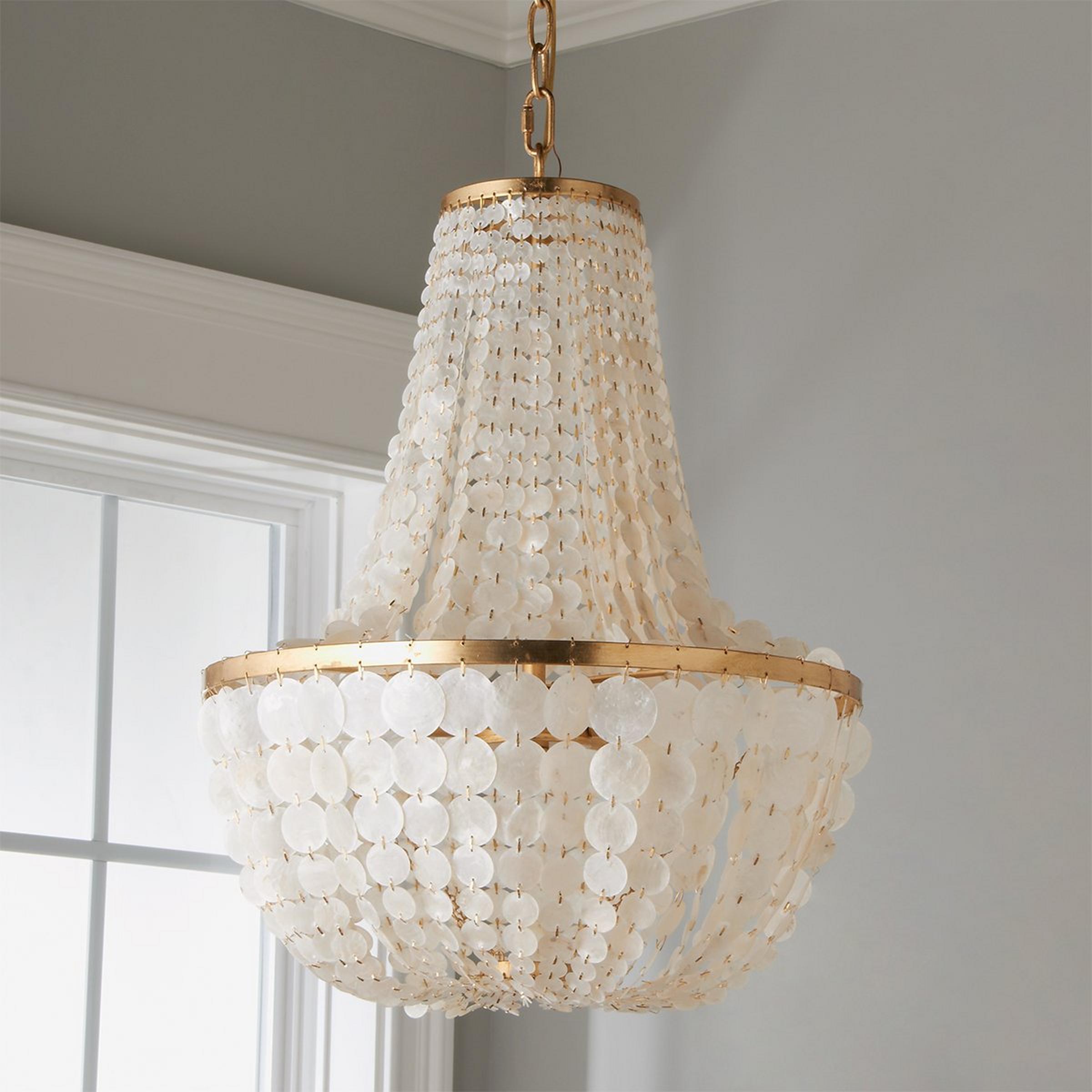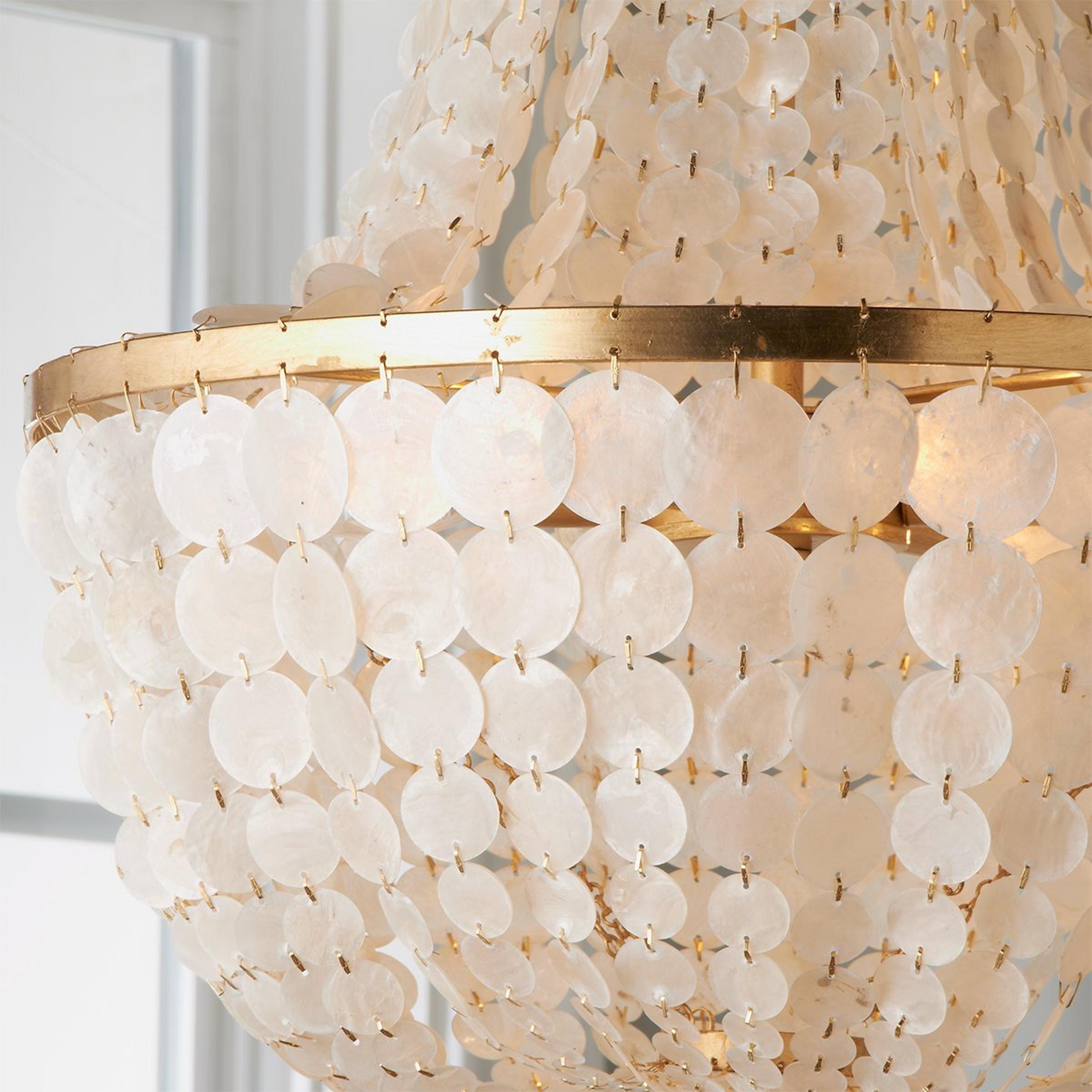 White iridescent capiz shell discs hang in a simple basket shape on this elegant and classic chandelier.