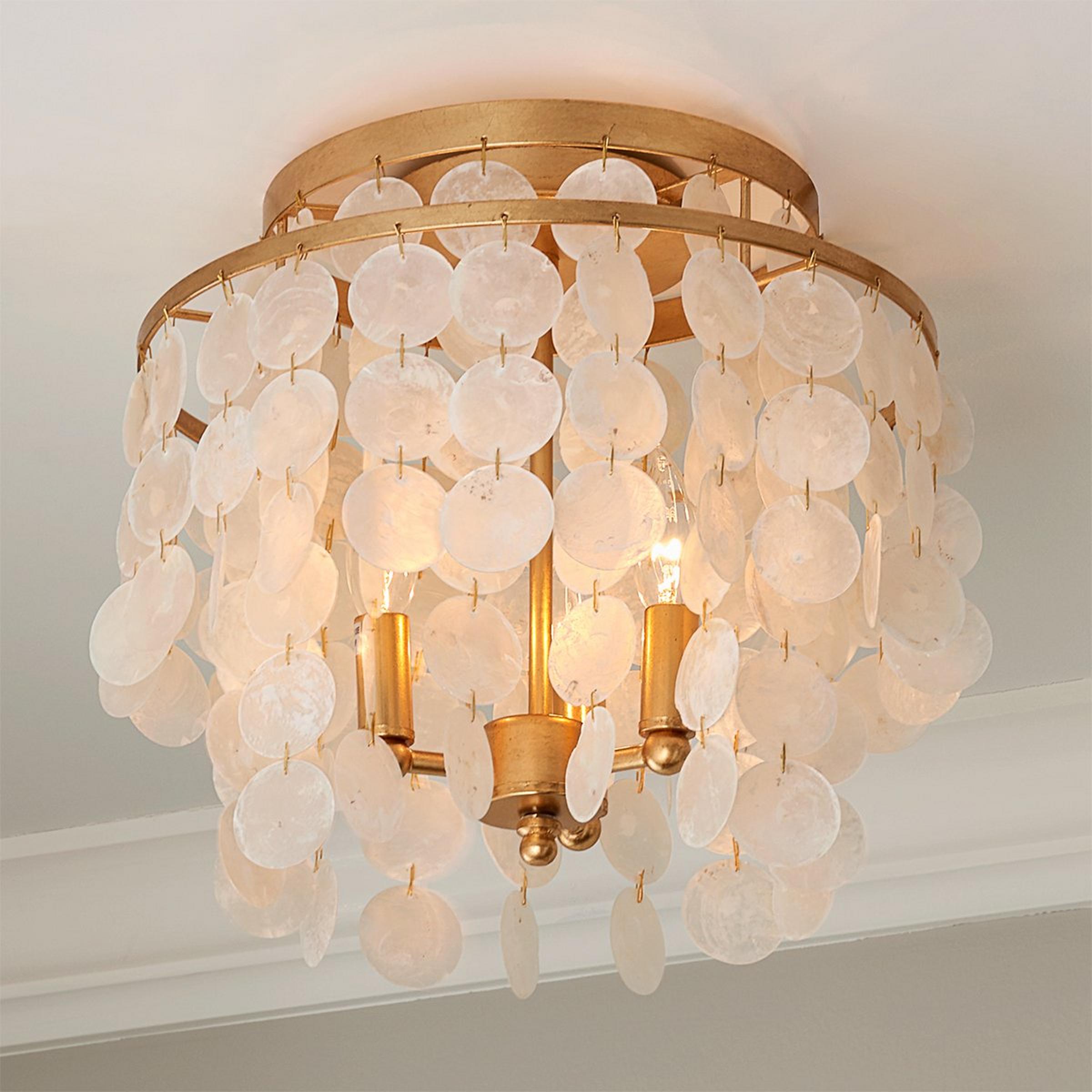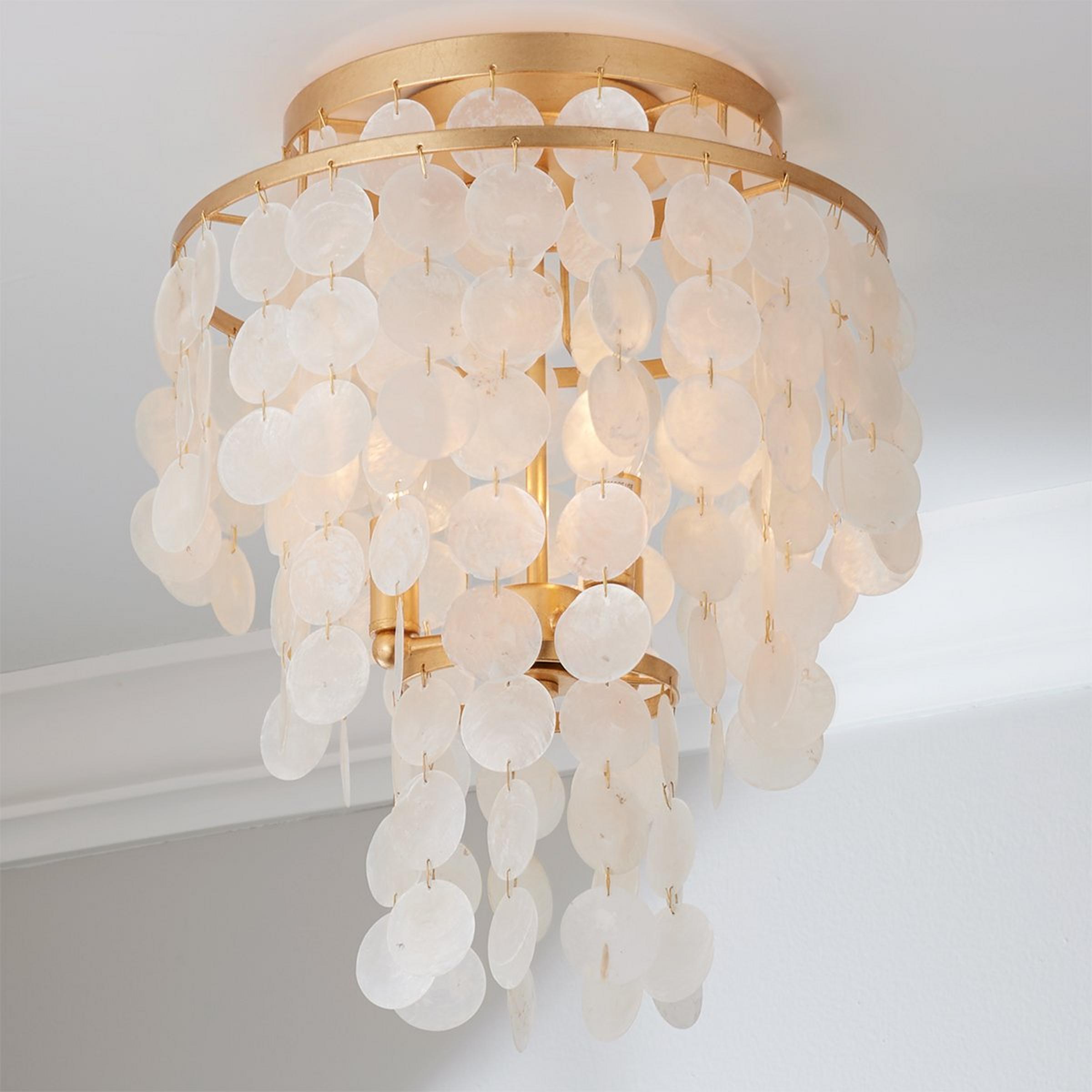 White iridescent capiz shell discs hang in multiple tiers from this elegant and classic round frame. Can be hung with two tiers or three!