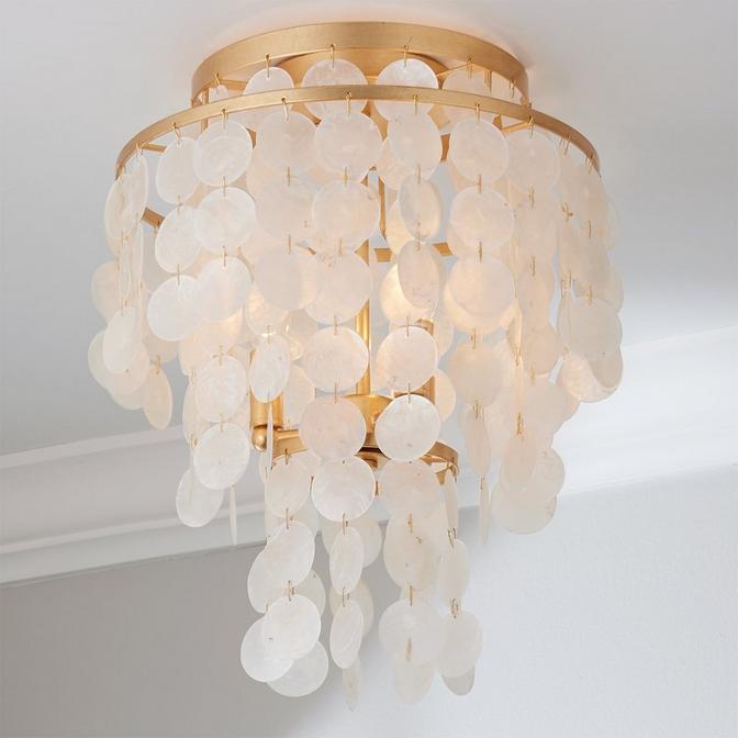 White iridescent capiz shell discs hang in multiple tiers from this elegant and classic round frame. Can be hung with two tiers or three!