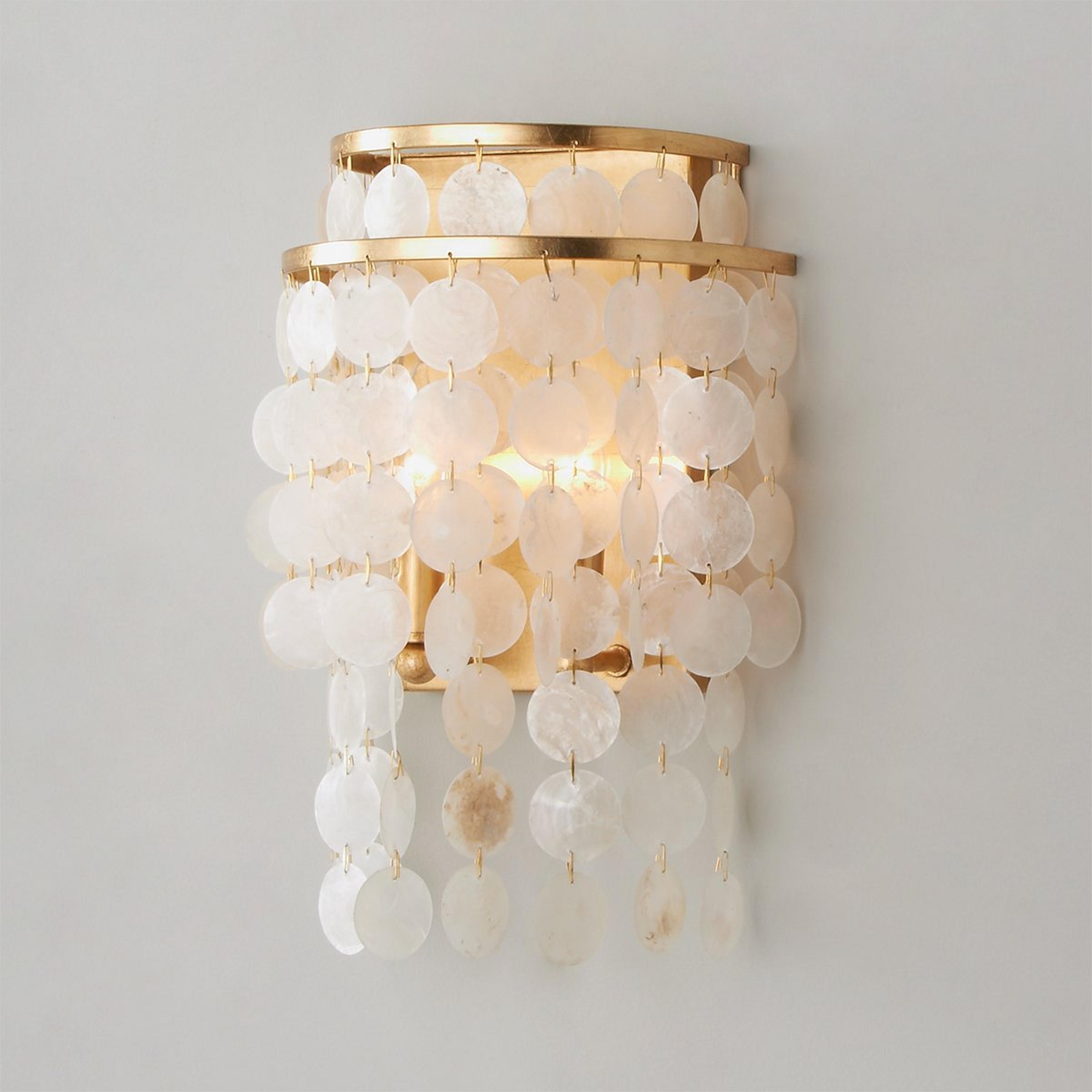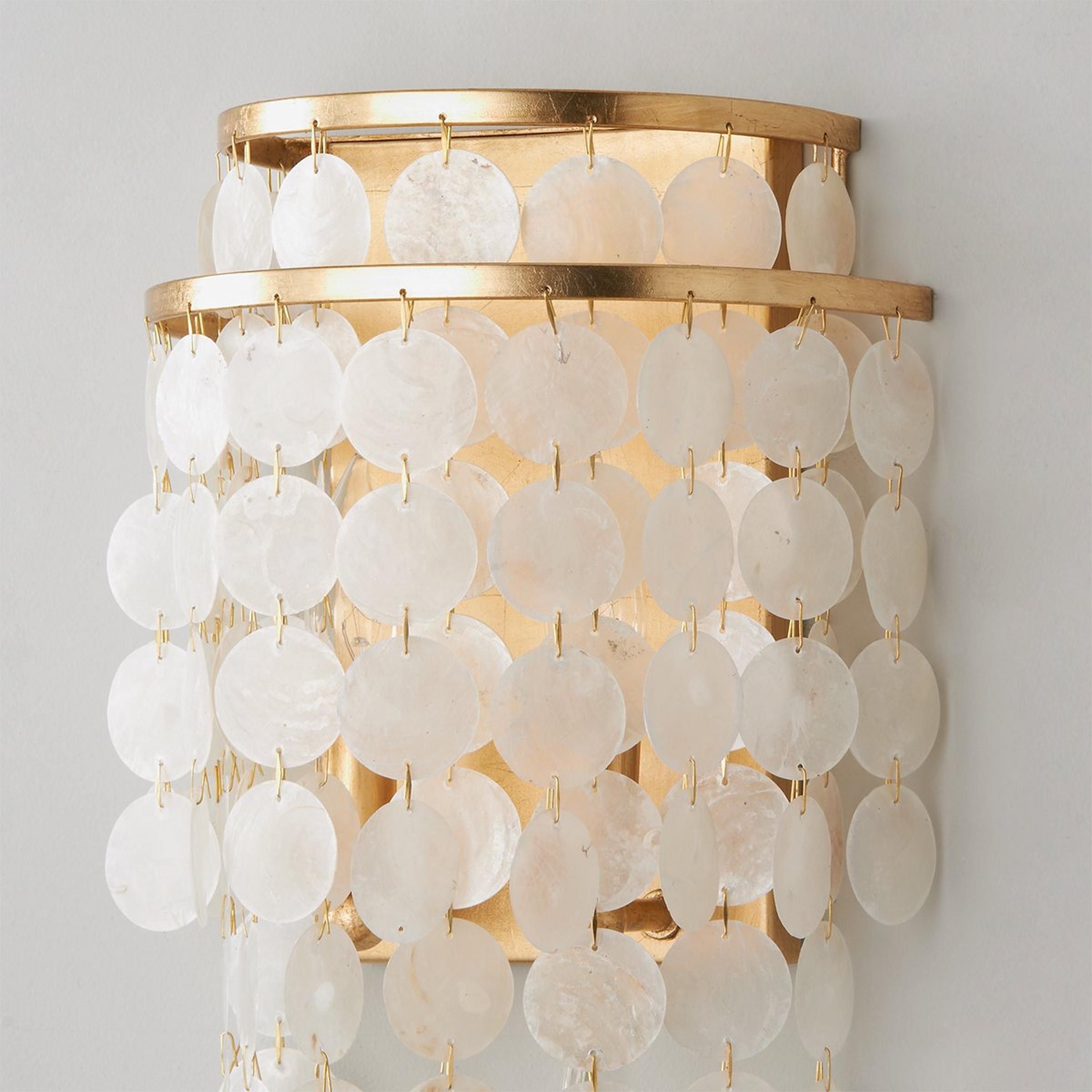 White iridescent capiz shell discs hang in multiple tiers from this elegant and classic sconce frame.