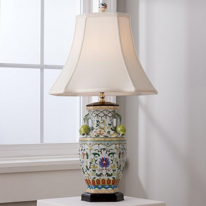 A classic traditional porcelain table lamp with colorful Asian floral design and pomegranate handles is the perfect addition to your conventionally designed home. Topped with a high-quality silk French cut-corner rectangular shade, this is a statement piece for guests to talk about!