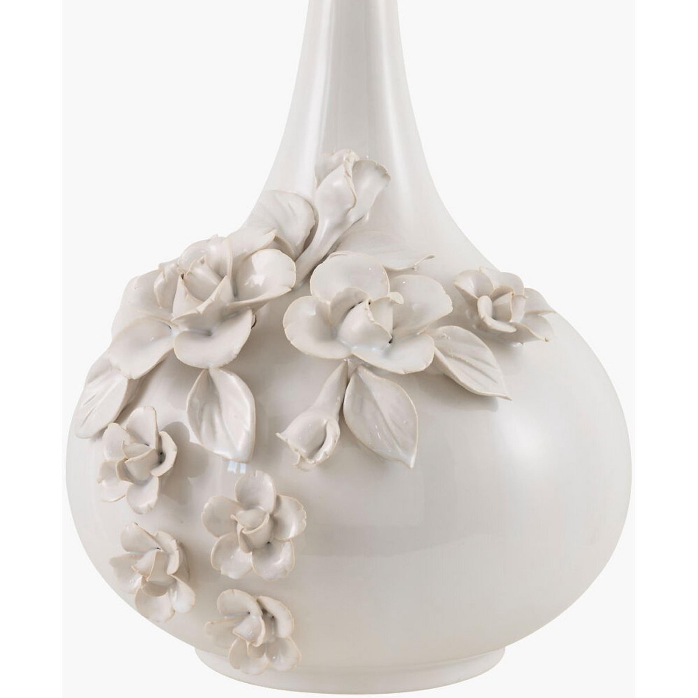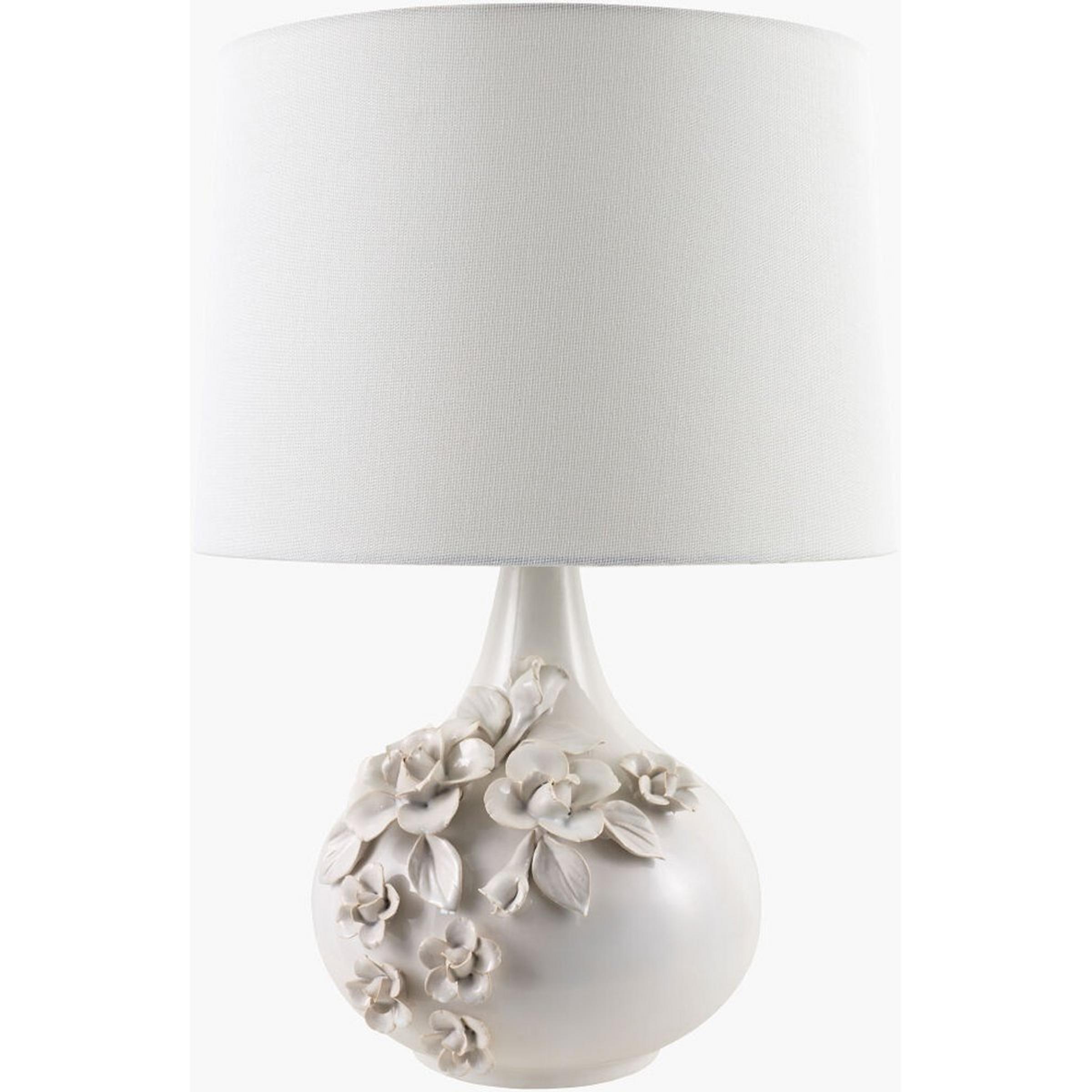 The Elizabeth Table Lamp brings a soft, romantic glow to any room through its blend of craftsmanship and organic form. The ceramic base is shaped into a rounded silhouette adorned with sculpted flowers and leaves, that catches the light with subtle depth. A cylindrical fabric shade diffuses the warm illumination into a calm, inviting halo, enhancing this lamp’s serene presence. Placed on a bedside table, console, or reading nook, the Elizabeth Lamp functions as both lighting and décor—an elegant statement piece that adds texture, artistry, and a touch of botanical charm to the space.