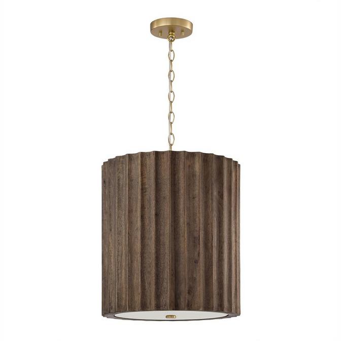 The elongated wooden drum shade that defines the Elvenia Collection brings bold style and soft luminance through its targeted glow. Hand-carved waves highlight the stunning pattern of natural woodgrain for a look that combines organic splendor with exceptional craftsmanship. This chandelier creates a warm ambiance in smaller spaces or brightens a room perfectly in pairs, enhancing both illumination and style. Beautifully combining its frame's polished finish with the shade's natural textures, this ambient light enhances your decor with effortless sophistication.