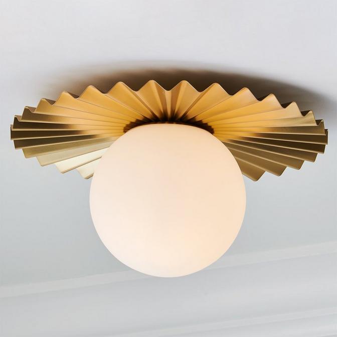 With a pleated metal mounting plate softened by the graceful nature of an opal glass globe, this fashion-forward ceiling light is exactly what you need for an En Pointe interior.