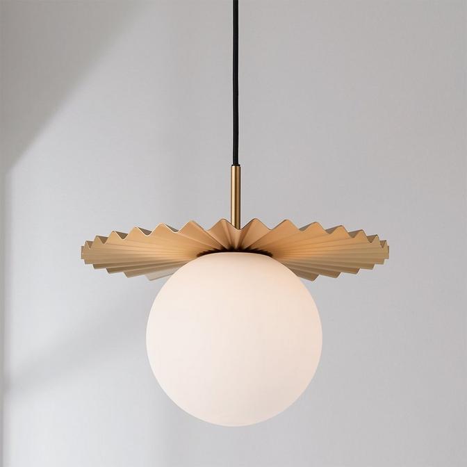 The distinctive visual appeal of this pendant consists of a single-drop design, a decorative pleated metal disc softened by the graceful nature of its matte opal glass shade. This fashion-forward fixture is exactly what you need for an En Pointe interior.