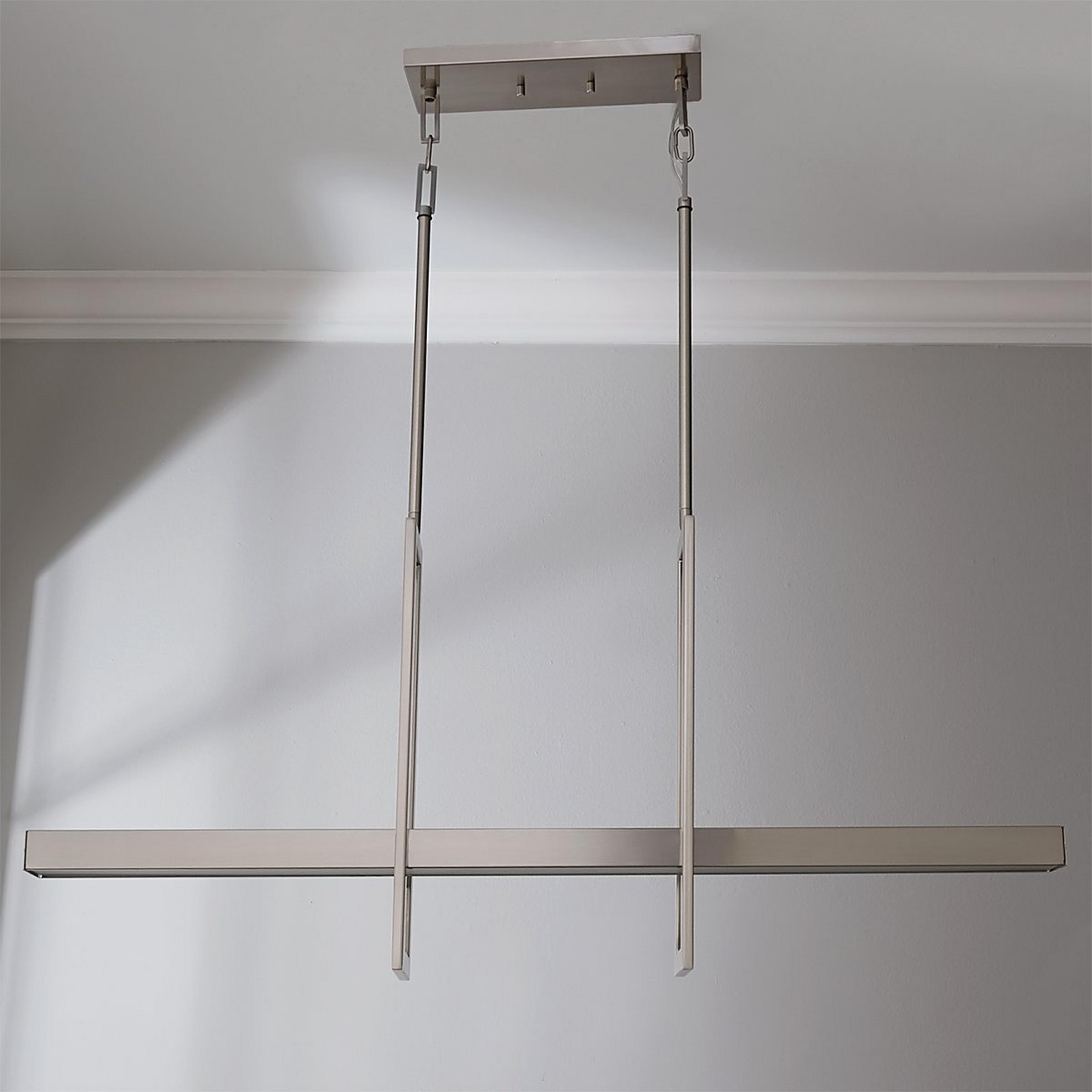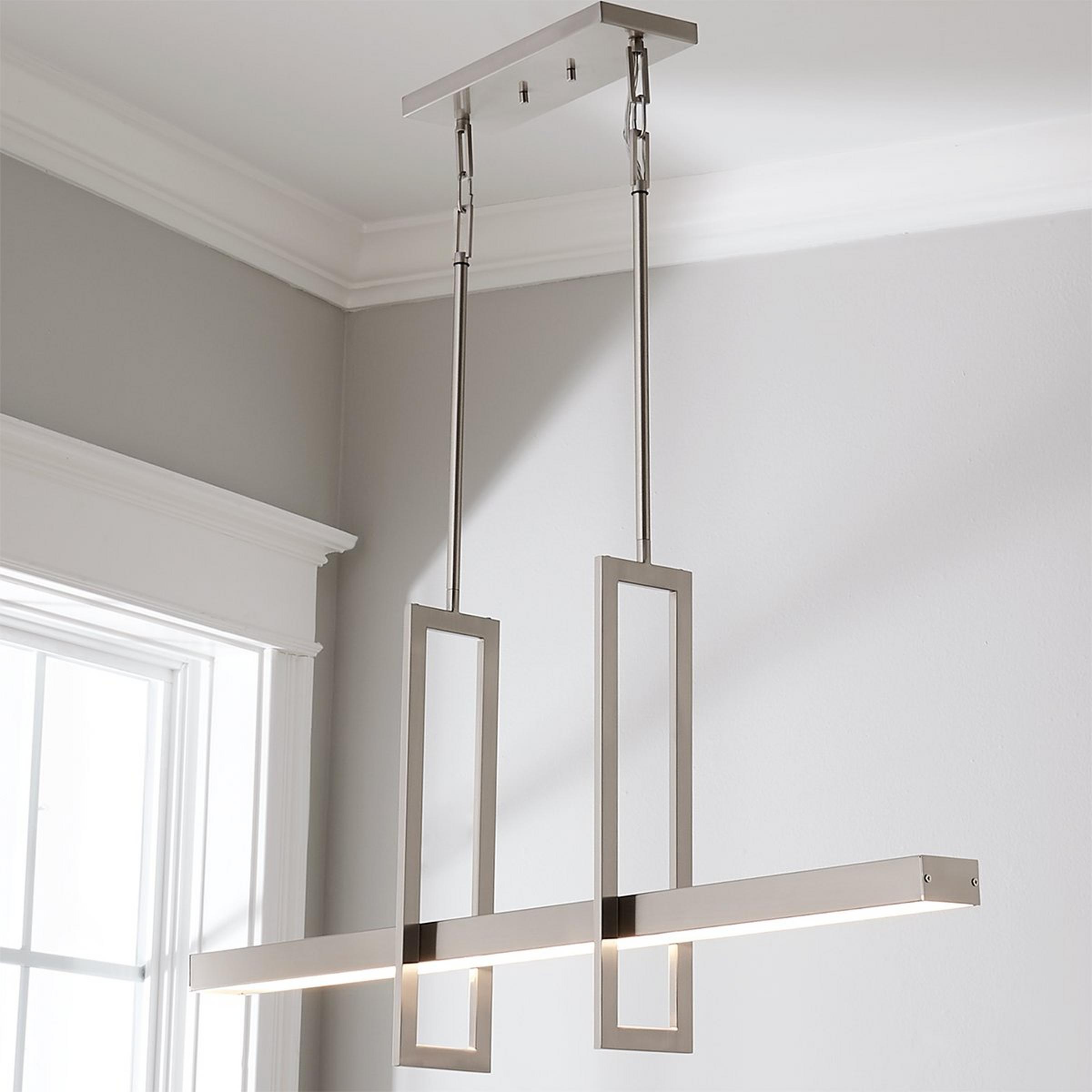 With floating frames intersecting a plane of concealed light, like a modern balance beam, this trendy modern dimmable LED chandelier adds undeniable style over dining room tables and kitchen islands. This sleek hanging light works well in spaces with modern and minimalist designs.