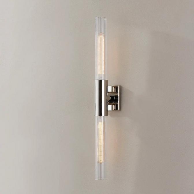 Modern and refined, this double-ended sconce adds a sleek touch to any contemporary bathroom. Its linear silhouette features two slender glass shades, brightening your space with a gorgeous glow.
