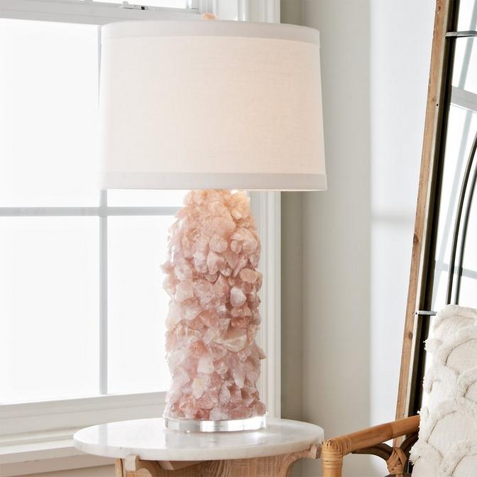 This handcrafted table lamp is a true work of functional art! Each lamp is made with a handcrafted base that is meticulously finished by hand and each stone is then placed by hand by one of our trained artisans. Available in semiprecious rose quartz, amethyst, or seaglass colored gemstones, this tumbled stone table lamp adds an elegance that only nature's colors can offer. Topped with a cream linen shade. Proudly made in America! Due to the handcrafted nature of this product and the natural size and color variation of the stone, no two will be exactly alike in shape, size, or color. Due to the fact that this is a natural stone and they are handmade no two will be exactly alike in shape, size, or color.