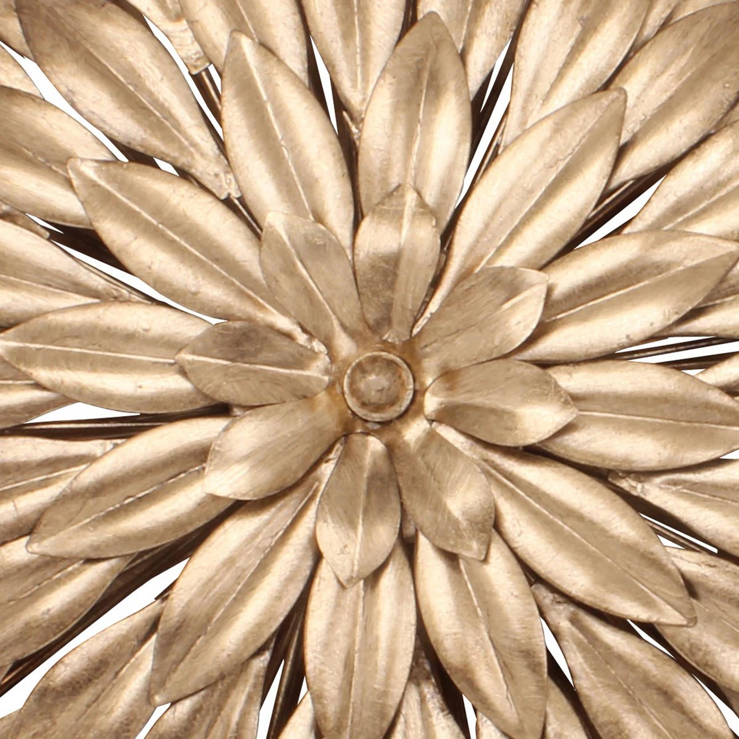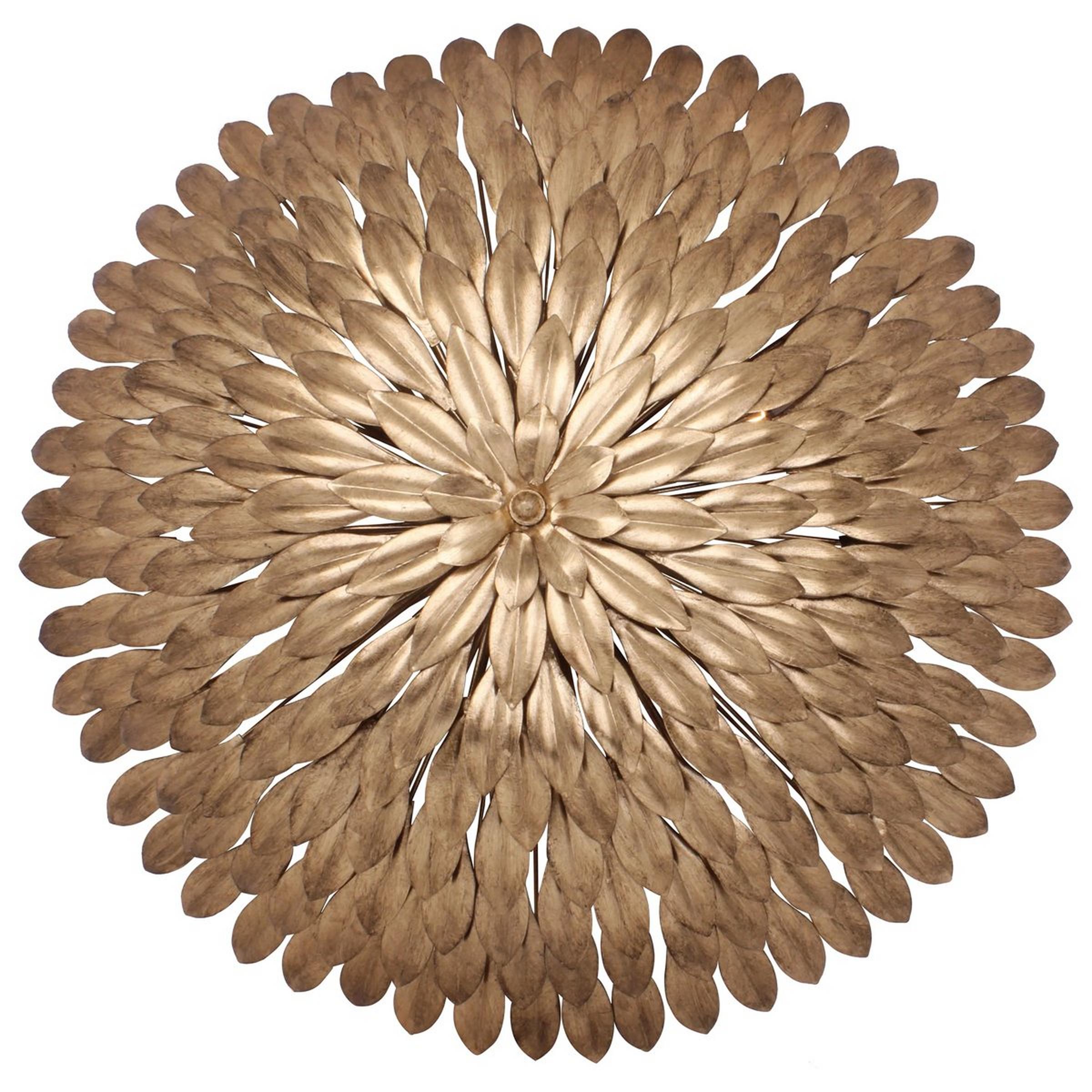 Sculptural metal olive leaves radiate outwards to form a cluster ceiling light with dramatic impact for large foyers and spacious living areas. This is a high style option for any room with lower ceilings.