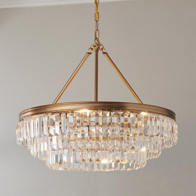 Contemporary and elegant, three layers of faceted rectangular crystals cascade down a metallic frame, giving this chandelier a sophisticated air. This striking centerpiece makes an elegant dining room chandelier.