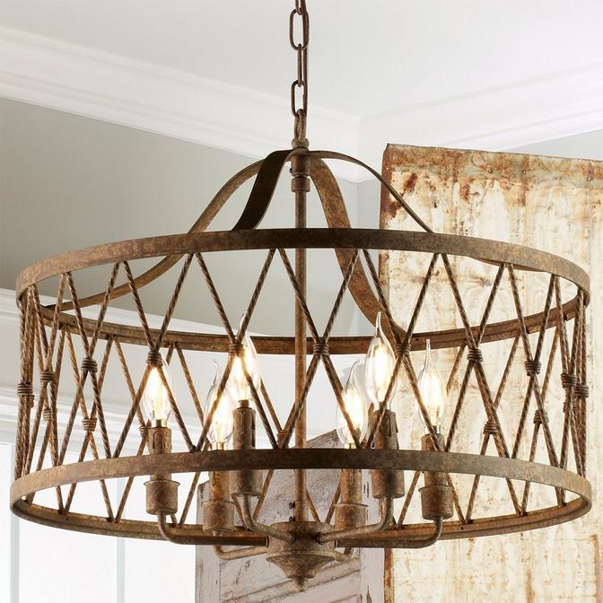 Simple but never plain, this drum-shaped chandelier showcases a rustic iron finish with hints of gold. Metal rope details form the attractive cage surrounding a candle cluster of gracefully bent arms. Perfect in a foyer, living room, bedroom, office or dining room. May also be hung as a semi-flush mount ceiling light.