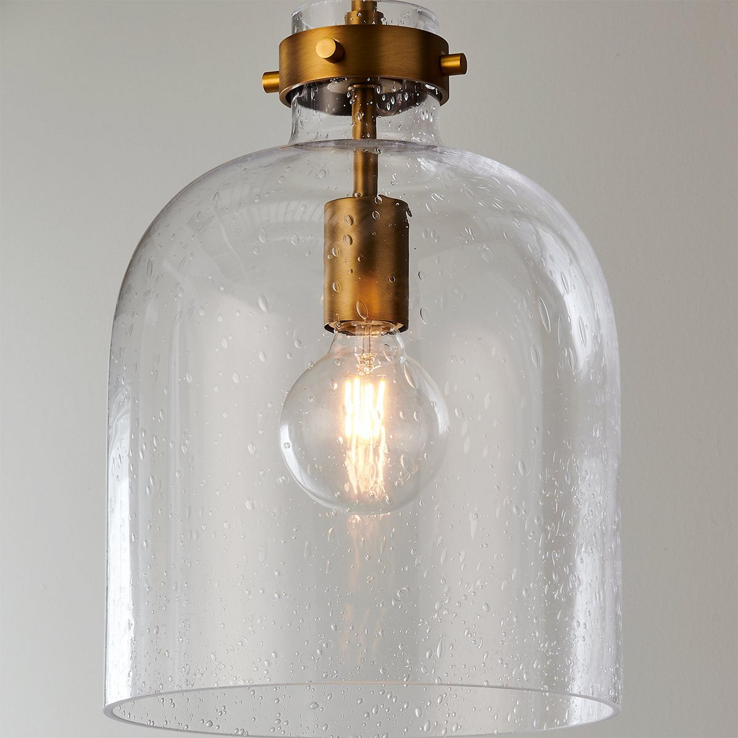 Faelyn showcases tailored and timeless details to enhance the visual footprint of a room. Its single-drop seeded glass dome design lends modern farmhouse appeal and produces soft ambient lighting ideal for over a kitchen island.