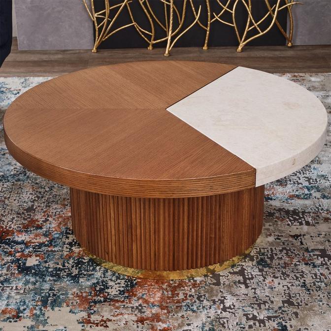 The Fanning Coffee Table exudes elegance and sophistication, blending mid-century modern inspired design with fine craftsmanship. Its reeded pedestal base made of solid oak with a brass plinth at the bottom adds a touch of luxury, while the oak veneer top with a slice of Crema Marfil marble wedged into it provides a beautiful contrast of materials. It's a piece that can truly elevate the look of any living space. Please note that due to the nature of natural materials, differences in color, texture, pattern, and veining or slight variations should be expected and celebrated; no two pieces will be exactly alike, adding to the unique nature of the table. Can be paired with the Small as a nested set.
