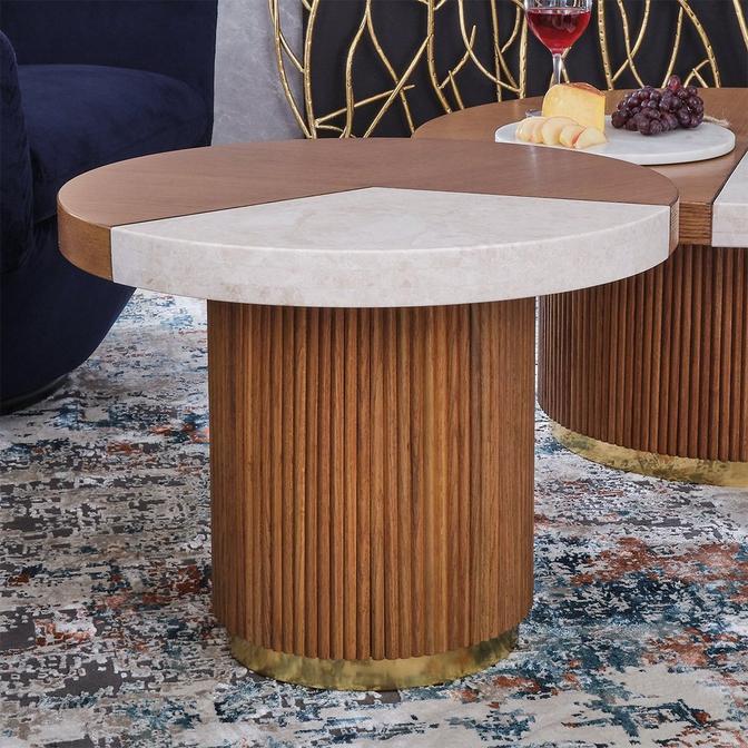 The Fanning Coffee Table exudes elegance and sophistication, blending mid-century modern inspired design with fine craftsmanship. Its reeded pedestal base made of solid oak with a brass plinth at the bottom adds a touch of luxury, while the oak veneer top with a slice of Crema Marfil marble wedged into it provides a beautiful contrast of materials. It's a piece that can truly elevate the look of any living space. Please note that due to the nature of natural materials, differences in color, texture, pattern, and veining or slight variations should be expected and celebrated; no two pieces will be exactly alike, adding to the unique nature of the table. Can be paired with the Large as a nested set.