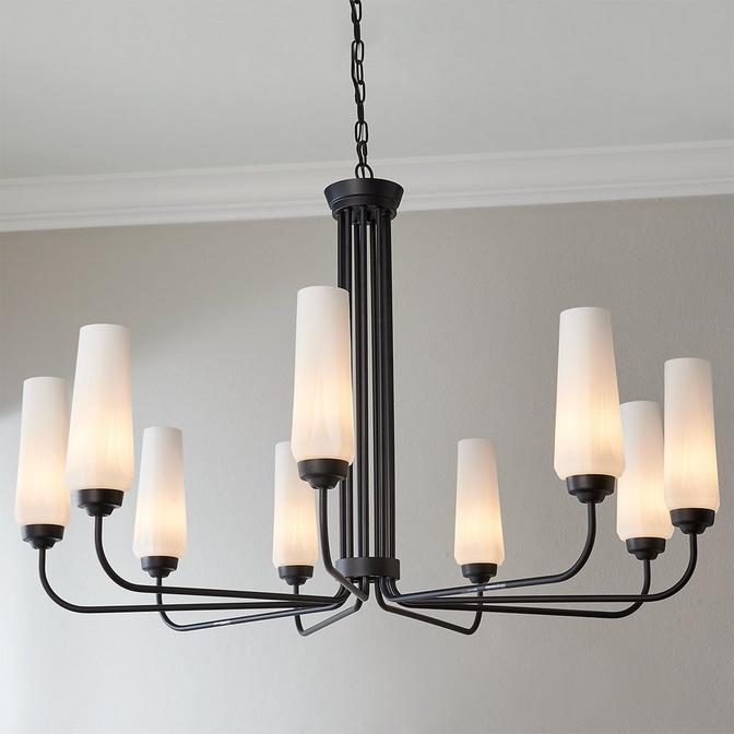 A stylish and sophisticated chandelier with sleek lines, art deco style, and tall opal glass shades, emanating warmth and inviting ambiance to any room. Style Fazi over a dining room table for an easy-on-the-eyes focal point.
