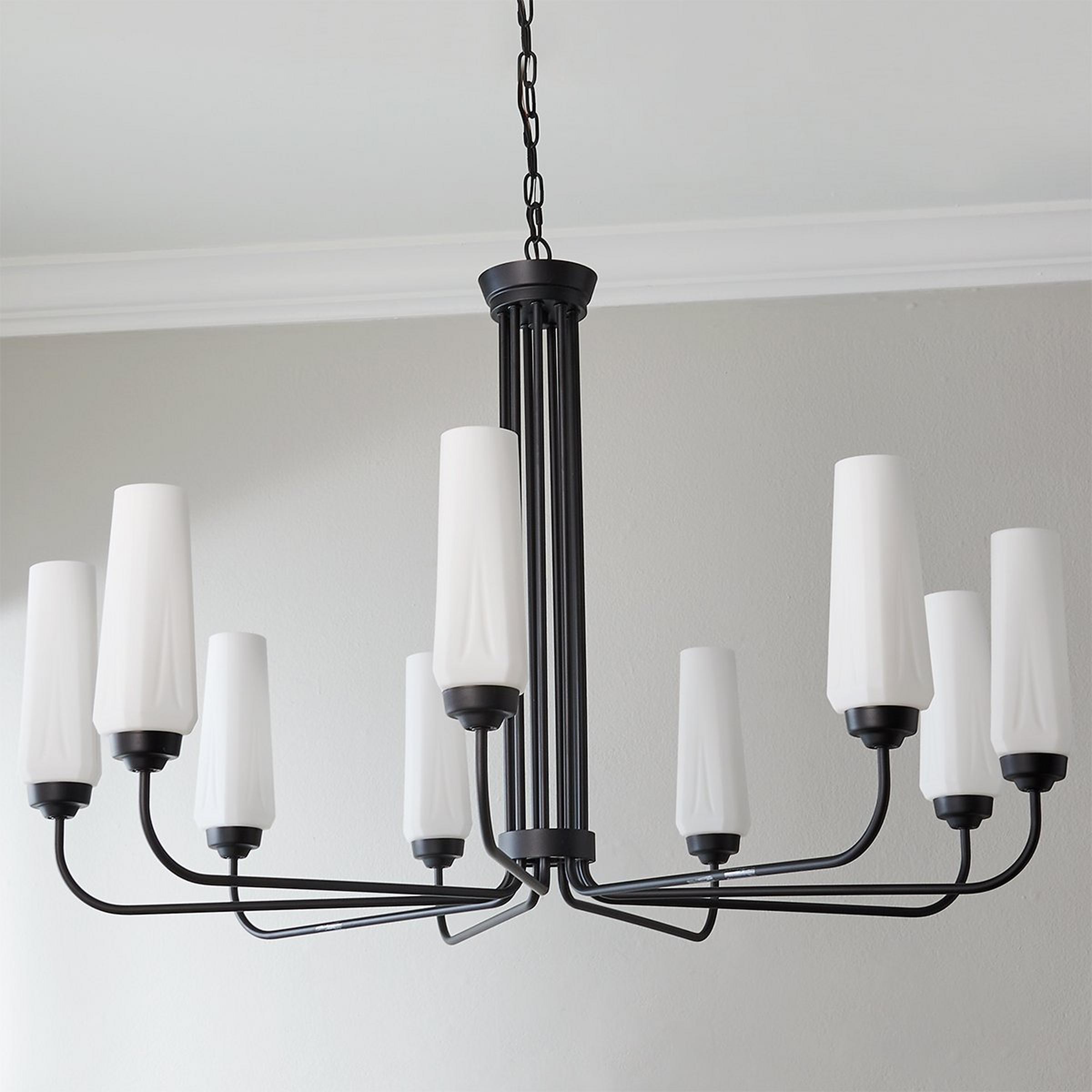 A stylish and sophisticated chandelier with sleek lines, art deco style, and tall opal glass shades, emanating warmth and inviting ambiance to any room. Style Fazi over a dining room table for an easy-on-the-eyes focal point.