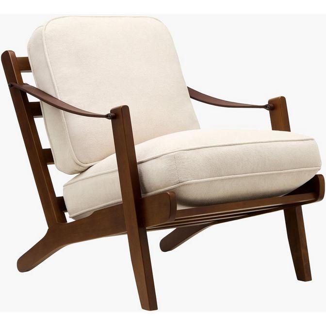 This accent chair has a distinct and comfortable lean, evoking a feeling of leisure with style. The luxurious cushions invite you to relax with their rounded edges and soft fabric. The sleek slatted frame evokes the charm of stylish outdoor chairs, blending comfort with a touch of elegance. Its rich wood tones pair perfectly with its leather arms, an innovative way to elevate your space with a cozy feel. Incorporating leather into its sleek frame creates a distinct appearance, allowing you to rest your arms stylishly!