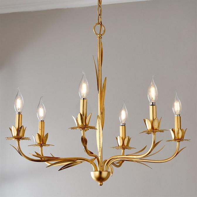 Winding leaves protrude from the sweeping arms to this chandelier, creating a light inspired by filigree. Regal and intricate, this fixture is a breathtaking combination of vintage inspiration and bold style. The base of each candelabra is a plumage of gilded petals that accentuate the fixture's shape and add detail. Evoke a formal setting in a dining room or create a grand entrance in a foyer with Fiabesco!