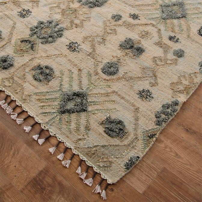 Soft tones run throughout our Finley Handwoven Rug to be integrated into your bohemian living room or ski lodge den. The free-spirited pattern is arranged with geometric shapes and linear accents with tassel ends to tie the piece together.