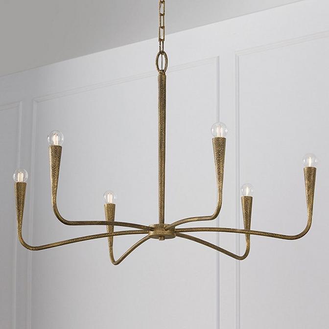 The handcrafted, hammered finish of this stunning chandelier adds character to your space through its bold texture. From the backplate and downwards to its custom chain, the signature finish envelops the entire fixture for a cohesive look. Its sweeping stems expand seamlessly into the candle sleeves for an elegant look. Their elegant curves create a refined silhouette that feels delicate, and with their recessed sockets, the stems resemble flowers. Create a feeling of whimsical sophistication as this chandelier's hammered frame adds dimension that sparkles in your space.