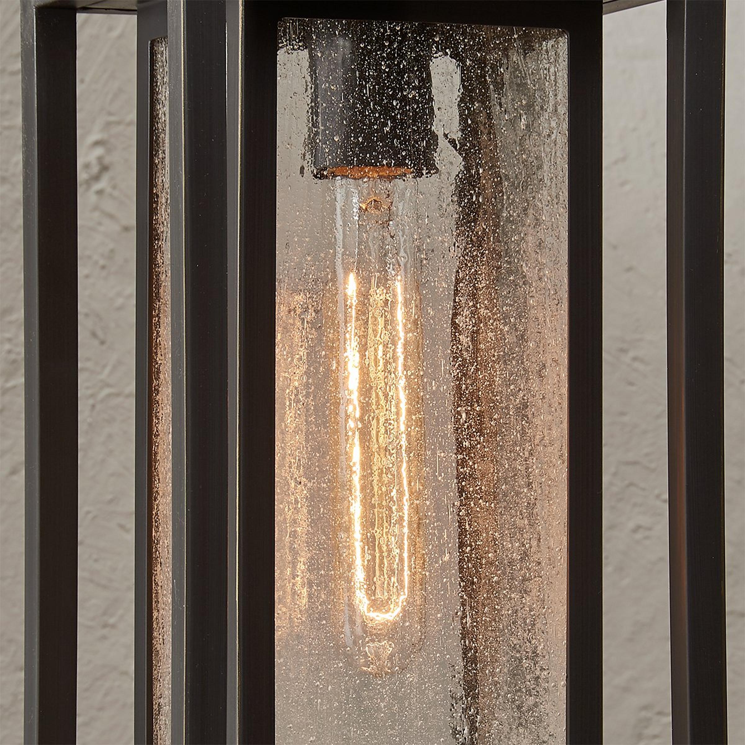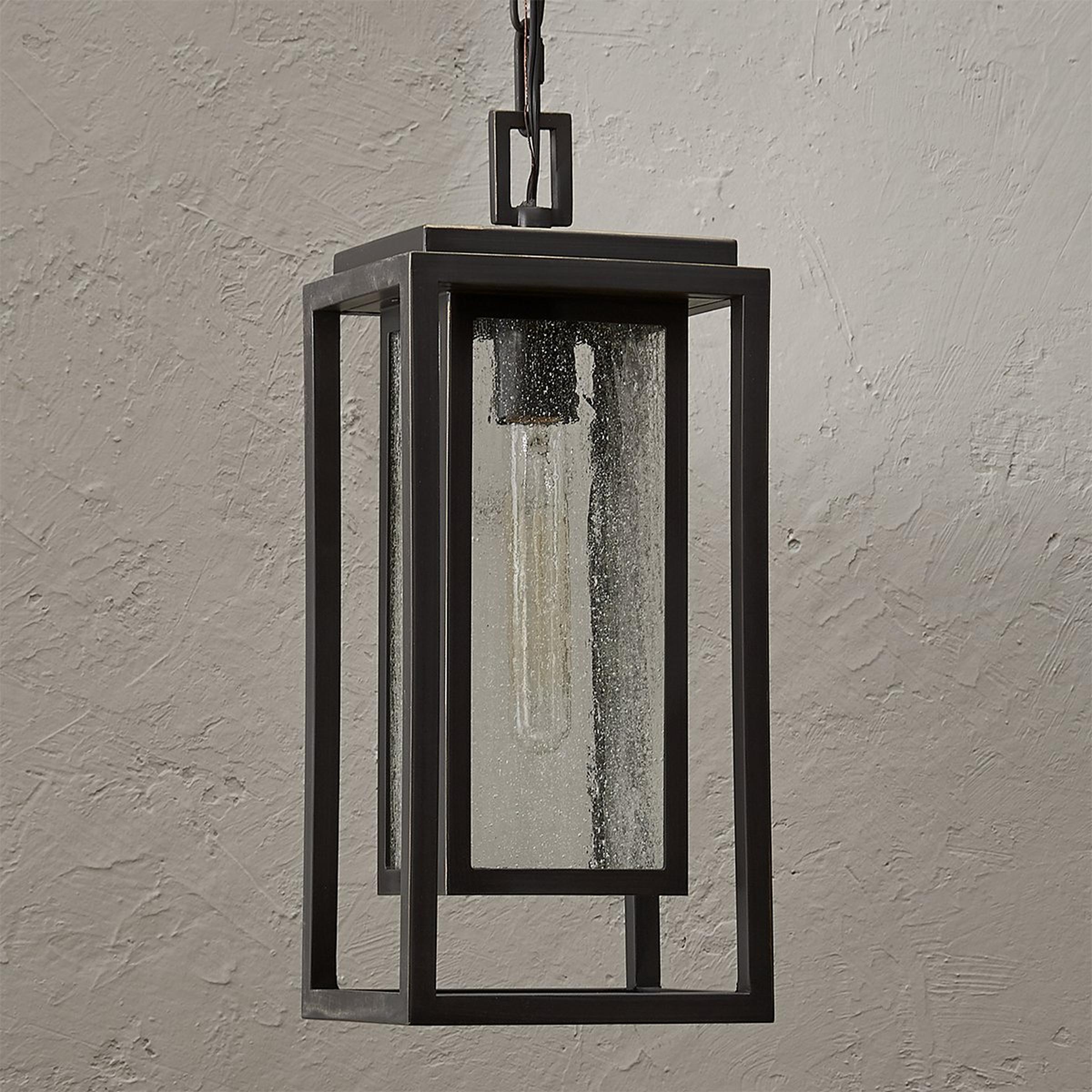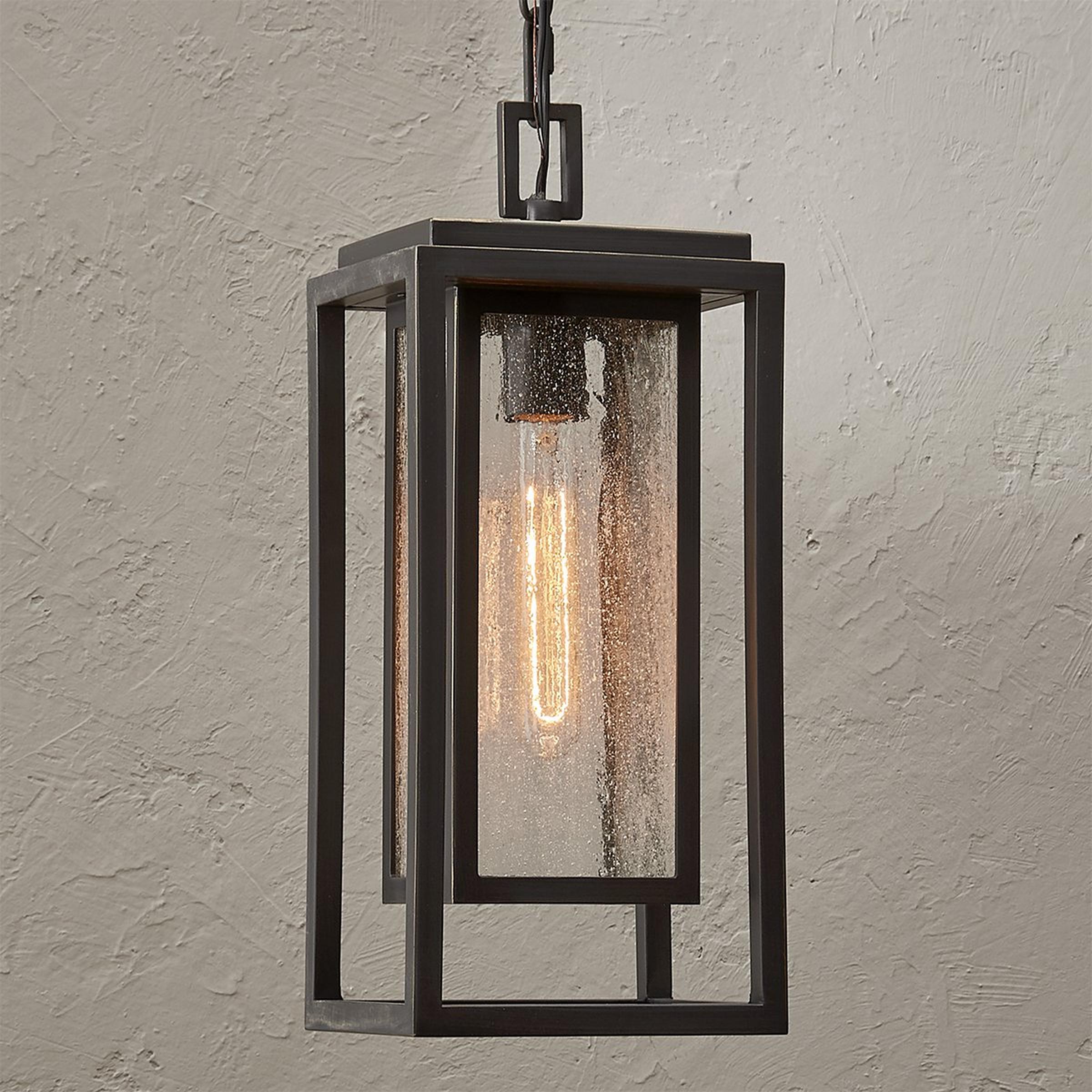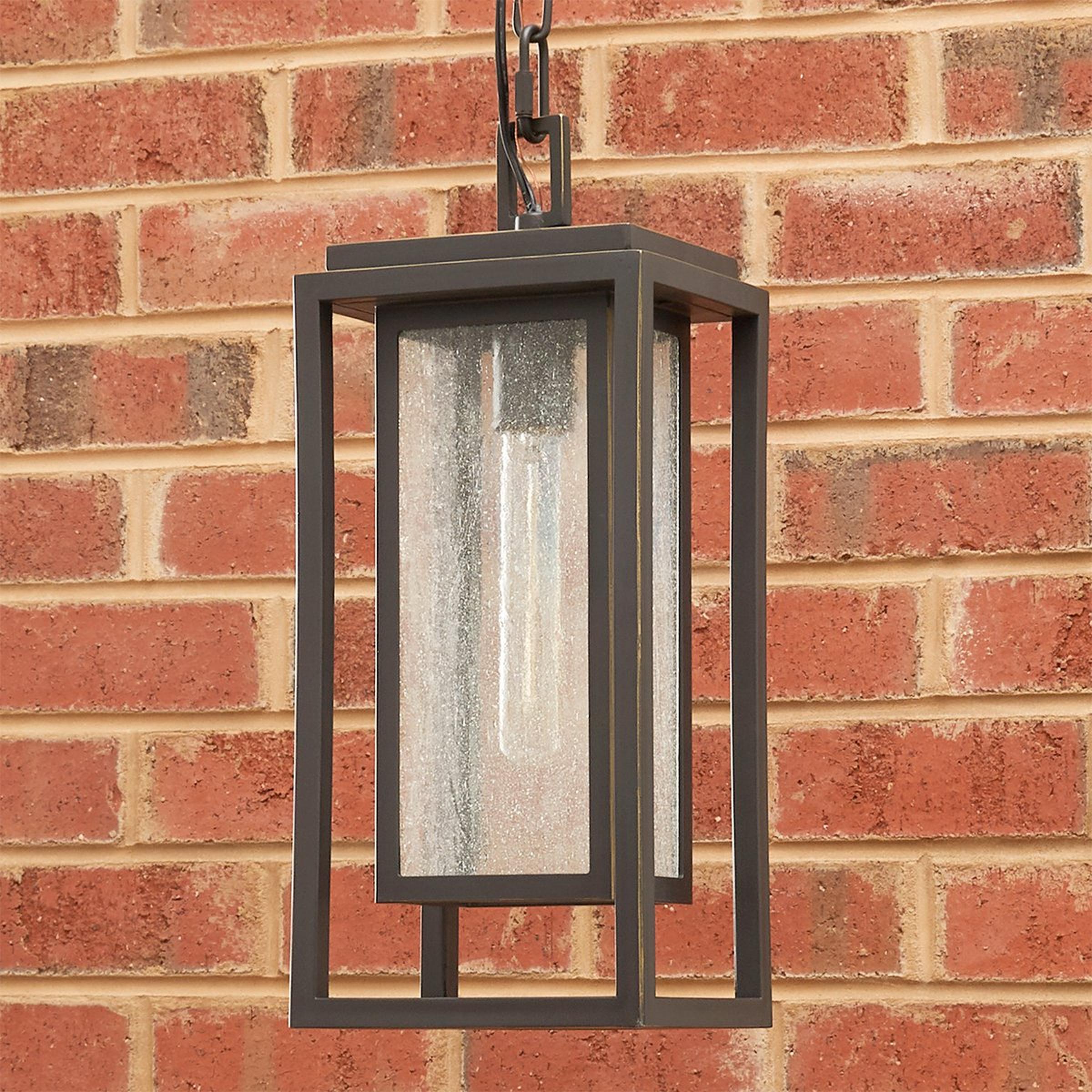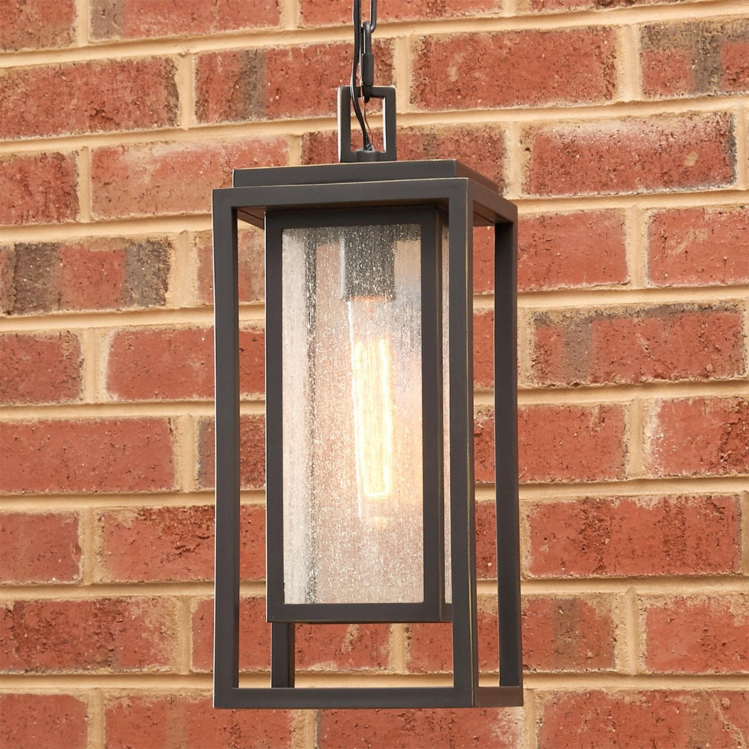 Simple, sturdy lines and a double framed design create a bold statement with this outdoor pendant. The clean style is complemented by panels of seeded glass that soften the whole look. Constructed of a durable composite material, this sconce is a good choice for coastal climates.