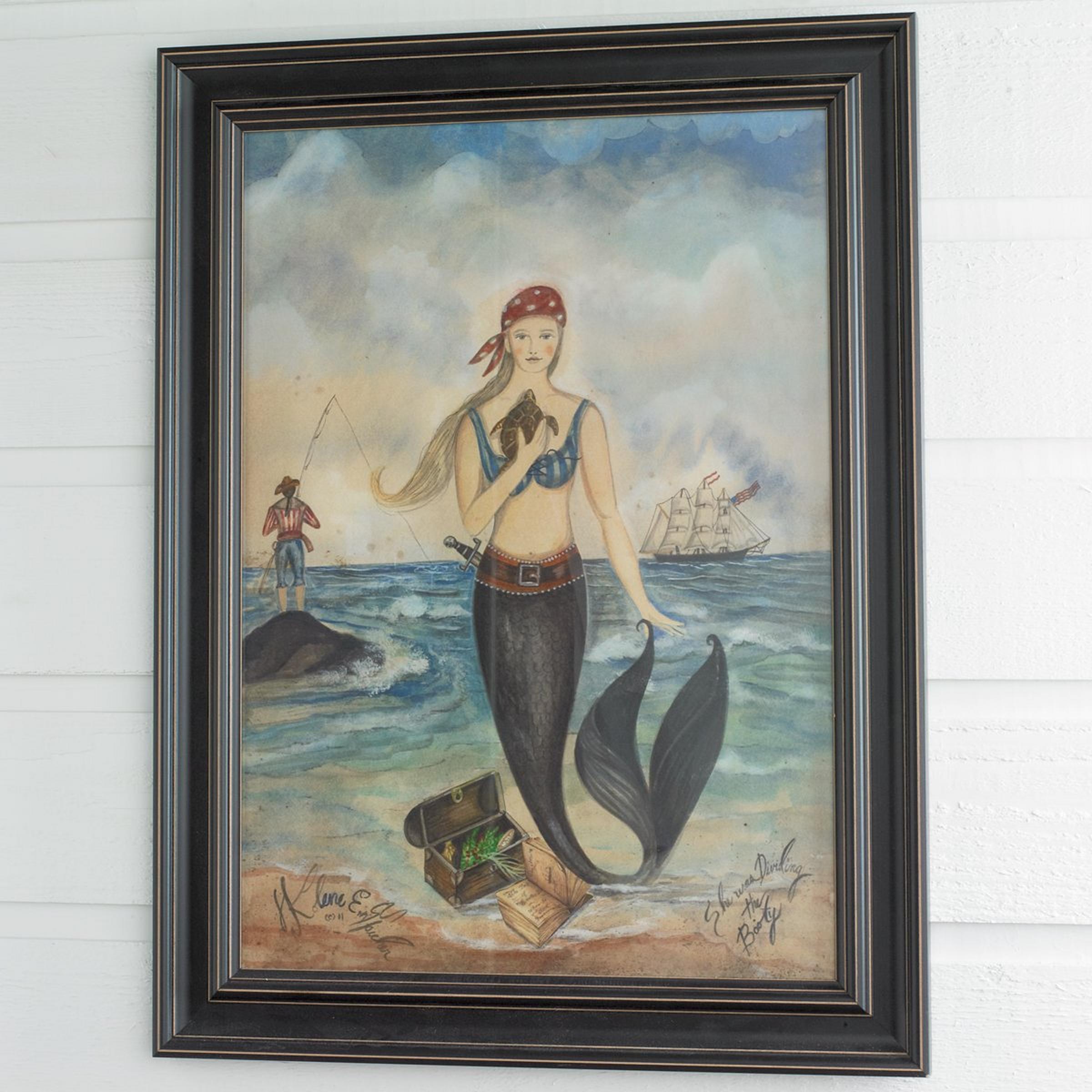 A curious 18th century mermaid is seen here exploring the shores of the New World . Black wood frame. 28"Hx21"W.