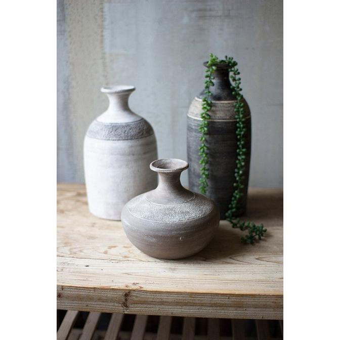 This trio of clay vases brings an art‑gallery stillness to any interior. Each piece is shaped with a distinct silhouette—one rounded and grounded, the others tall and slender—creating a harmonious interplay of height, proportion, and space. The matte finishes range from soft, chalky neutrals to a deep, moody charcoal, offering a palette that feels both easy and timeless. Whether styled together as a curated vignette or placed individually throughout a room, the Frances vases lend quiet sophistication—objects that feel collected, intentional, and beautifully understated. Dimensions" Large 6"d x 15.5"h Medium: 7"d x 15"h Small: 8.5"d x 7"h