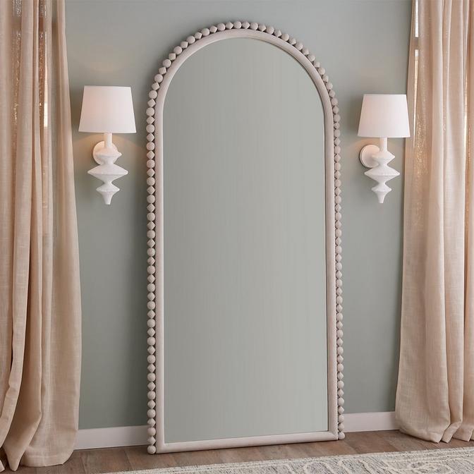 Understated and cute with a hint of glamor, this lovely mirror makes a perfect addition to your boho bedroom or cottage-inspired cabin. The distressed wood frame conveys an organic vibe; meanwhile, the decorative, sculptural trim provides a playfully polished finishing touch. Use it as a leaner for a casual look, or mount it vertically to liven up an empty wall. D-ring and French cleat mounting hardware included.