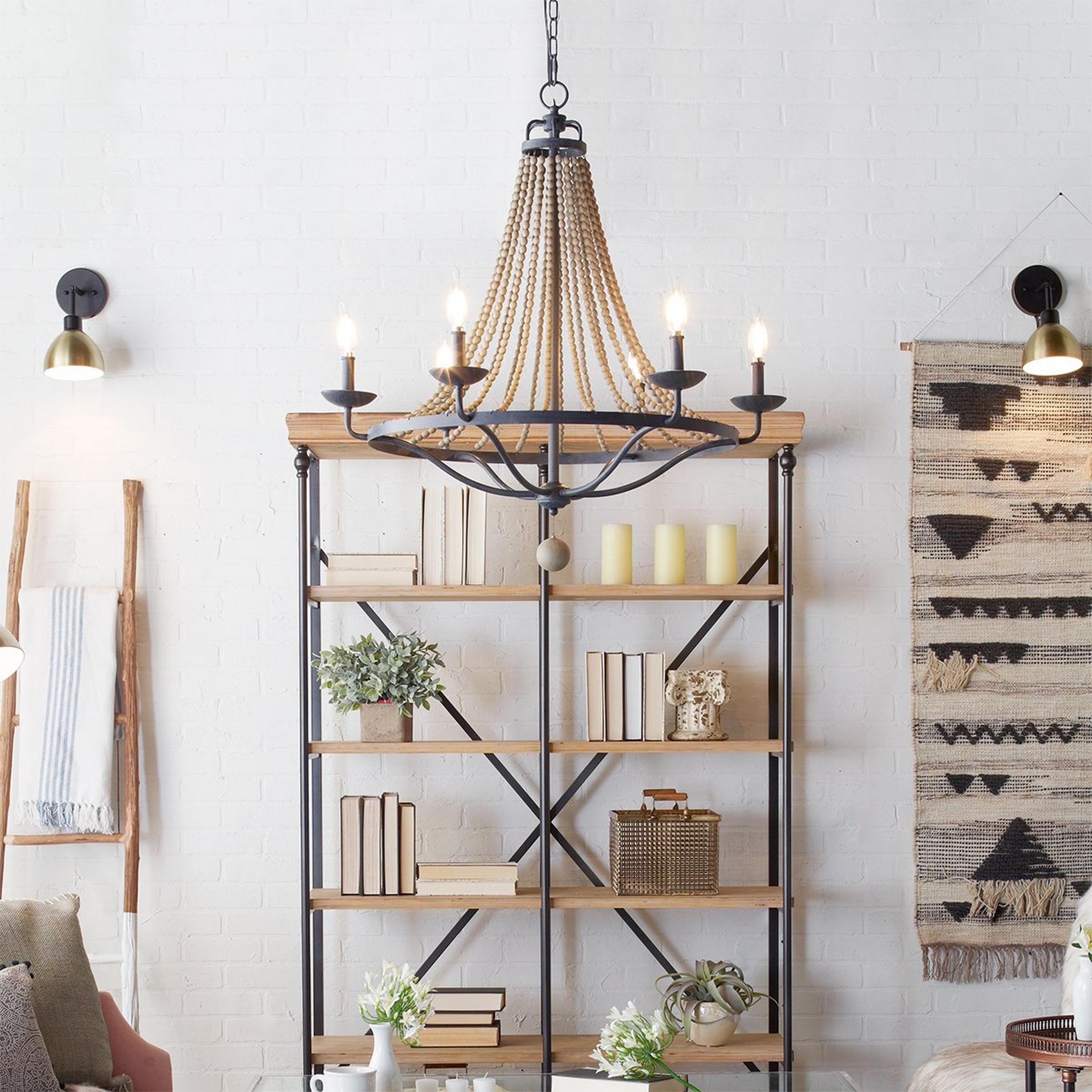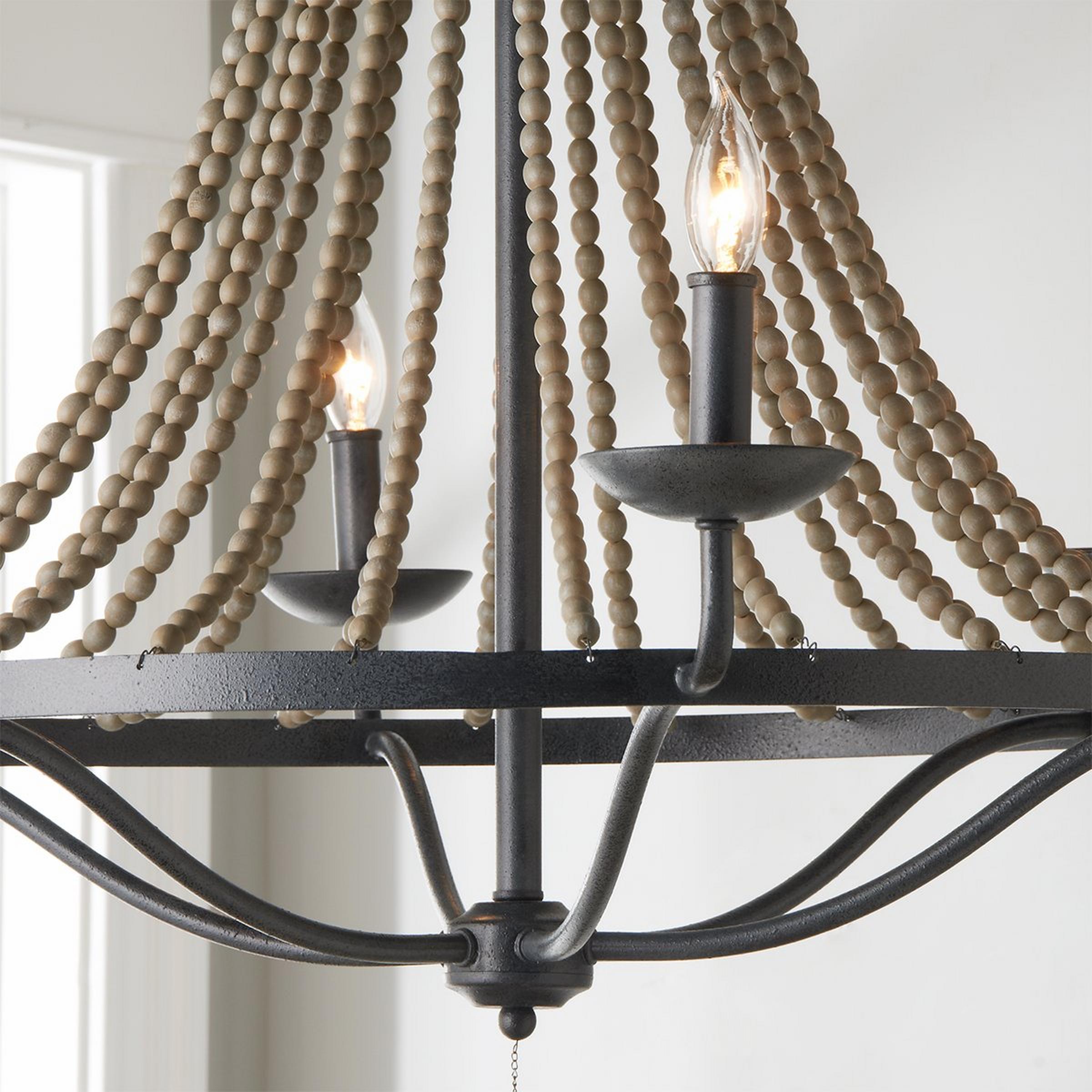 The classic body of this traditional ring chandelier gets a splash of rustic charm with a rich, dark weathered zinc finish and driftwood beads that elegantly drape down from the top of the chandelier.