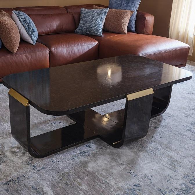 Inspired by modern motifs with a hint of art deco flair, the Fritz Coffee Table boasts a compelling, criss-crossed profile, softened by gently curving corners. Gold-toned metal caps and a distressed maple finish add a bright and authentic vintage feel.