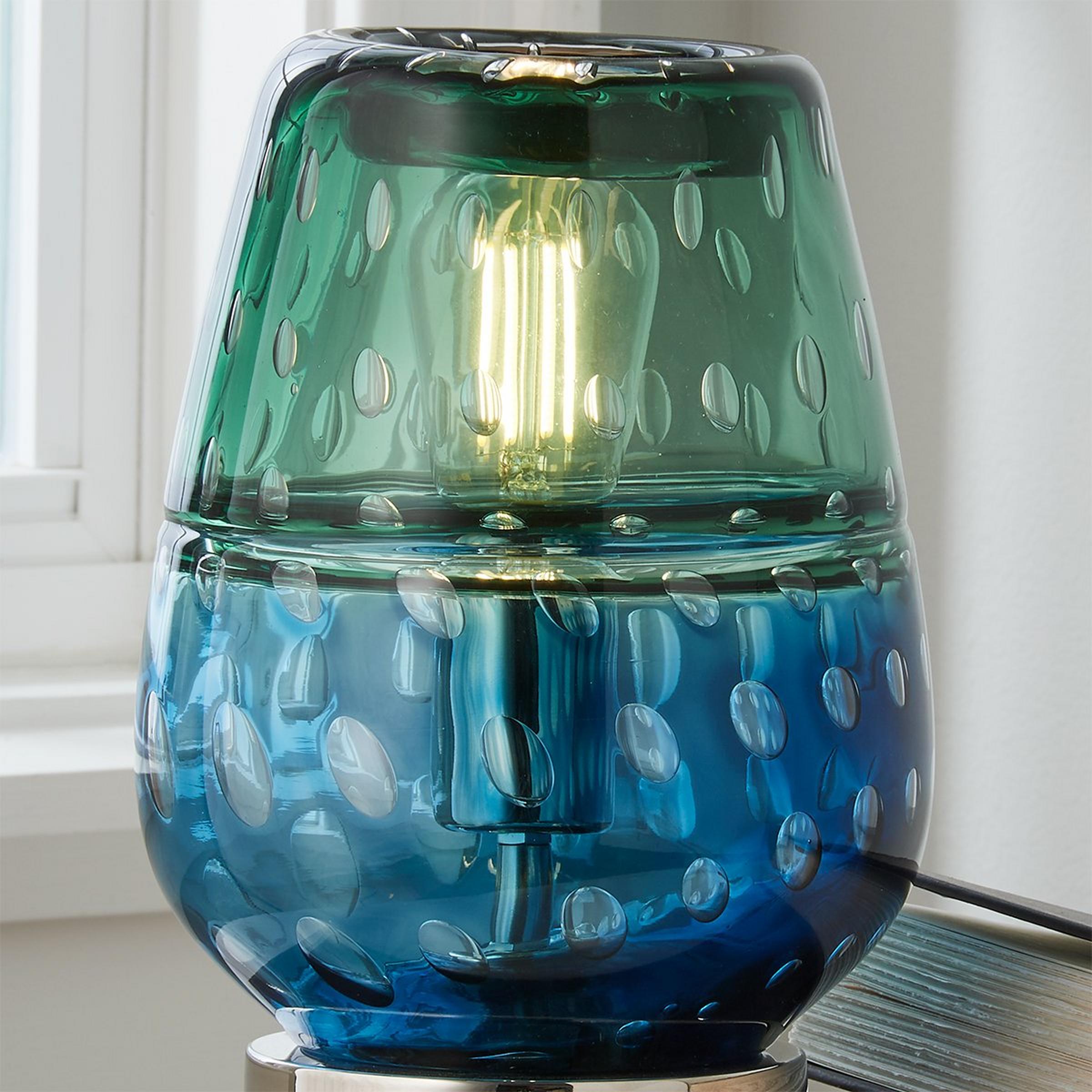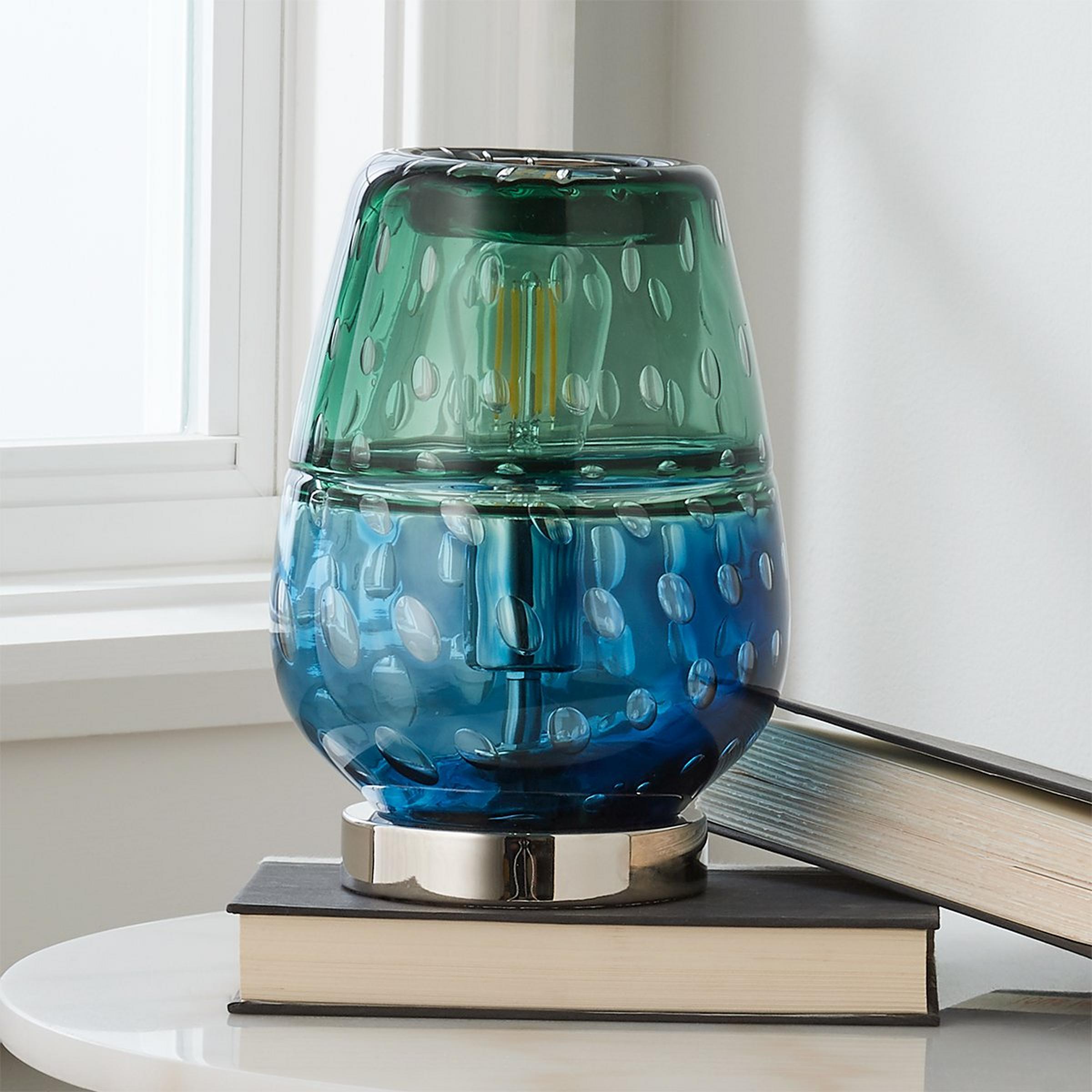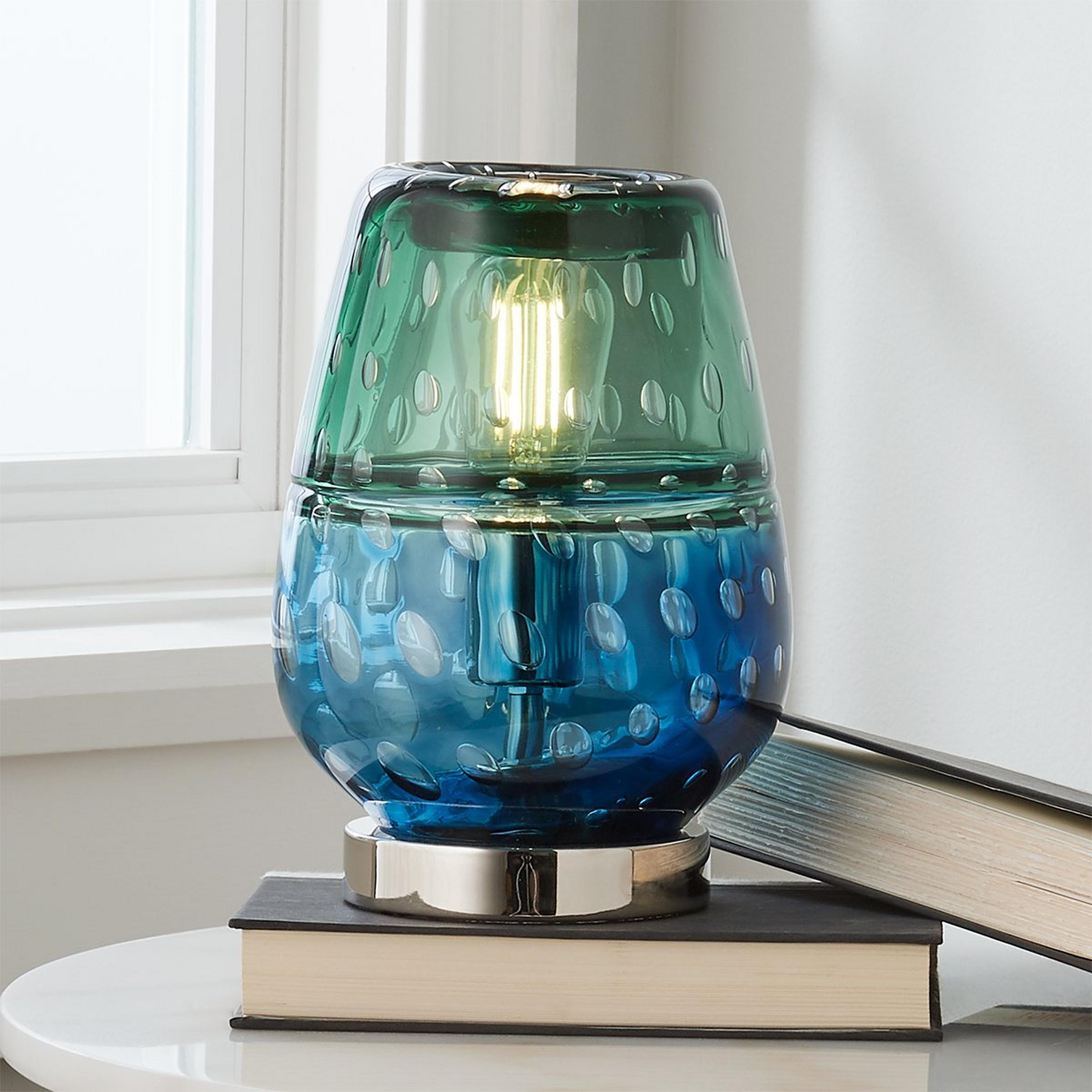 Bright green and blue art glass with large bubbles are fused together in this fun, coastal ready modern table light. Perfect on a beach house bar or as a pop of color on a traditional bookshelf. This light is assembled by hand in our Richmond, Virginia production facility. Due to the nature of art glass no two will be exactly alike in color, pattern, or shape.