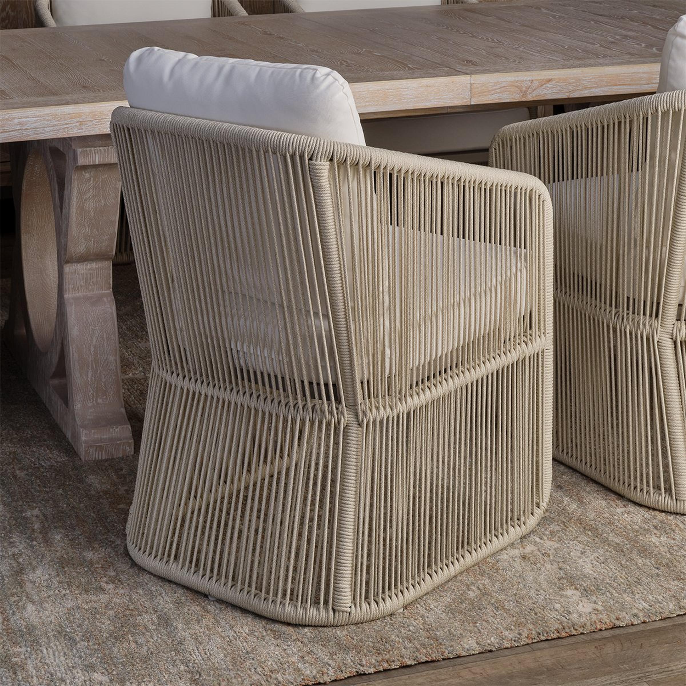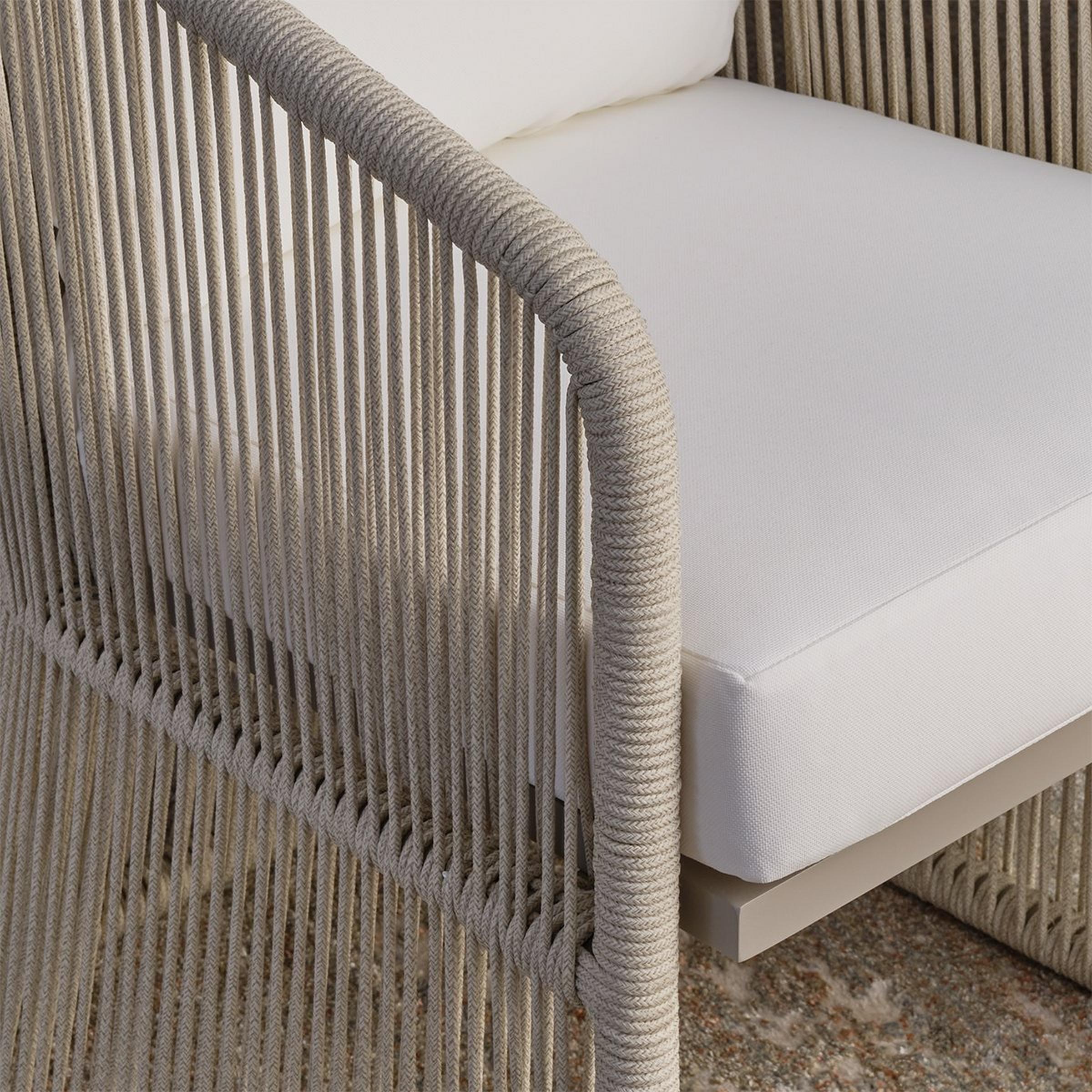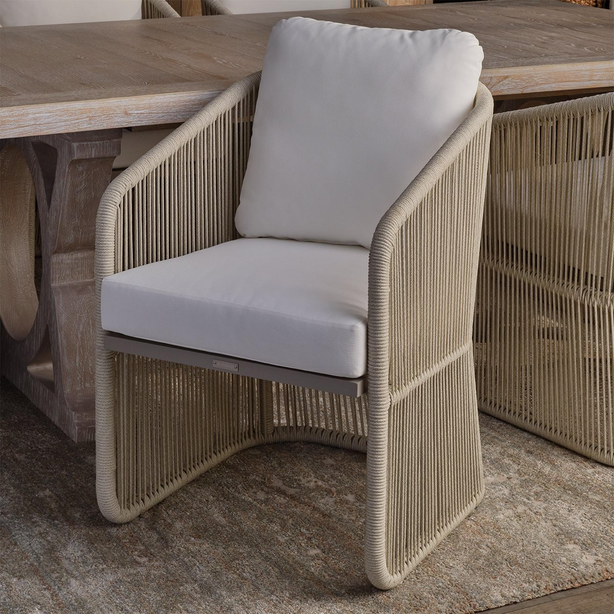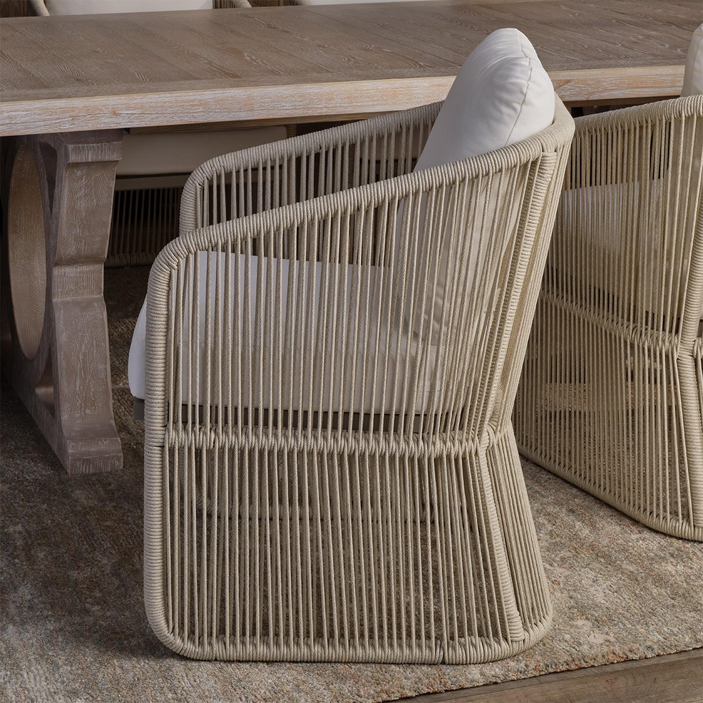 Infuse your outdoor space with refined modern elegance through the stunning Galicia Outdoor Accent Chair. Adorned in white outdoor fabric with a powder-coated greige aluminum frame, it is finished with cream rope weaving on the seat exterior.