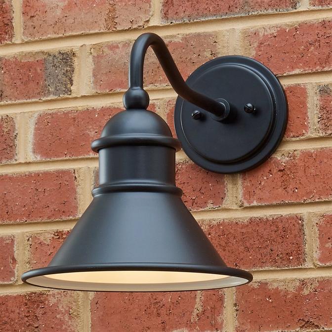 A vintage factory style takes the design of our Garner Outdoor Sconce by storm. The gooseneck arm curves down to the flared shade with a lighter interior. For a transitional style, add character to your outdoors with this simple yet chic fixture.