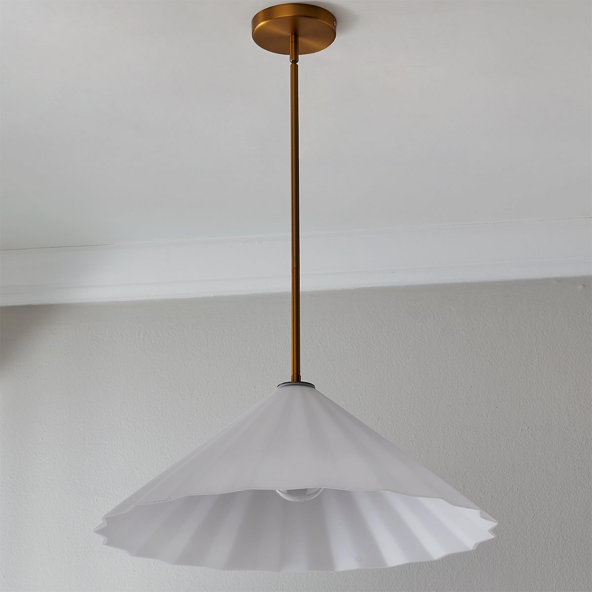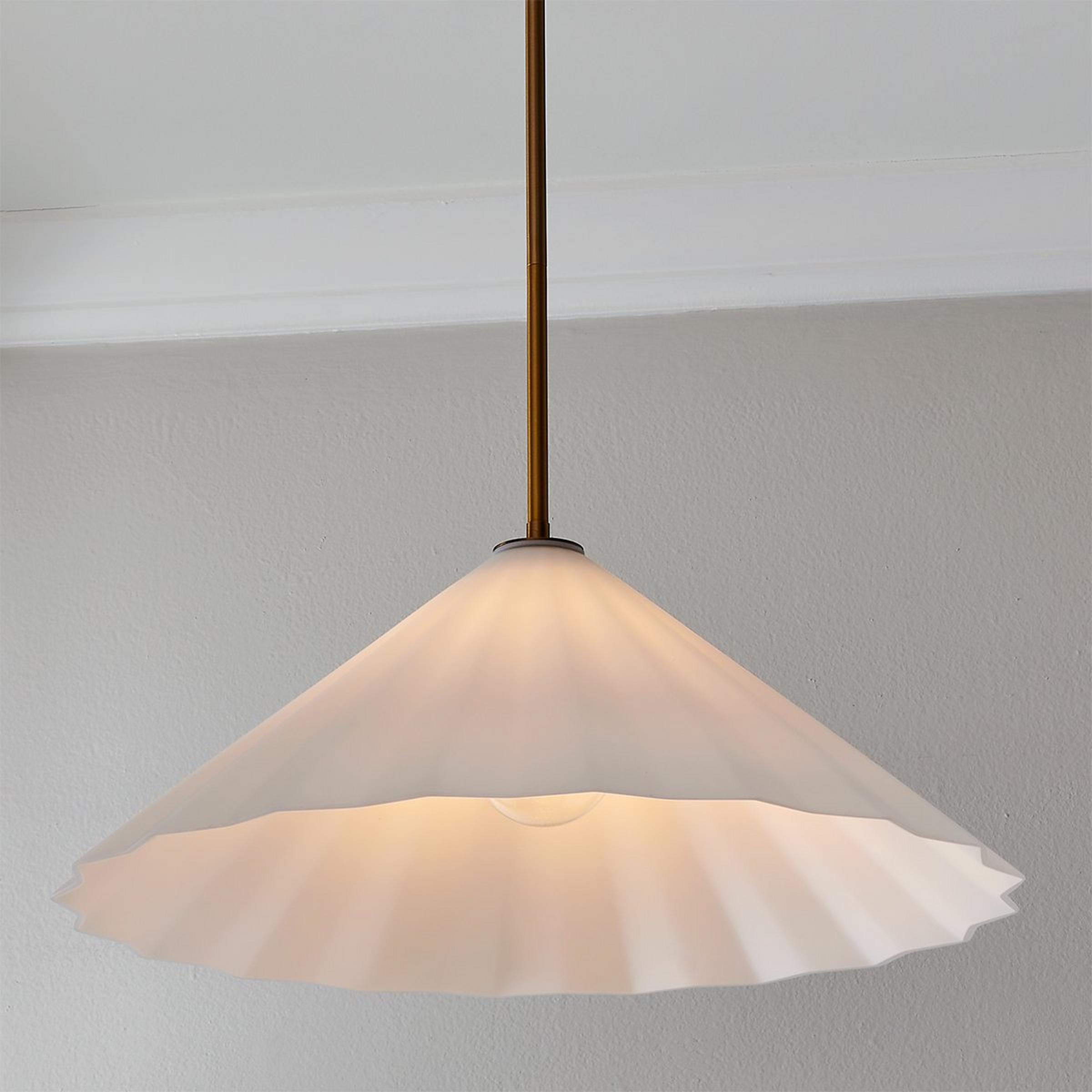 This delicately shaped glass pendant hangs daintily from a slender support rod. Gently edgy, the fluted shape of the semi-opaque glass spreads soft light across a room.