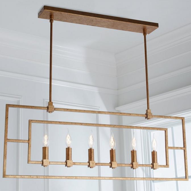 Contemporary style takes center stage in this chandelier with simple geometric shapes, angular lines and streamlined design. Two narrow rectangular frames connect in the center, creating a window within a window. Six candles sit inside the smaller frame.