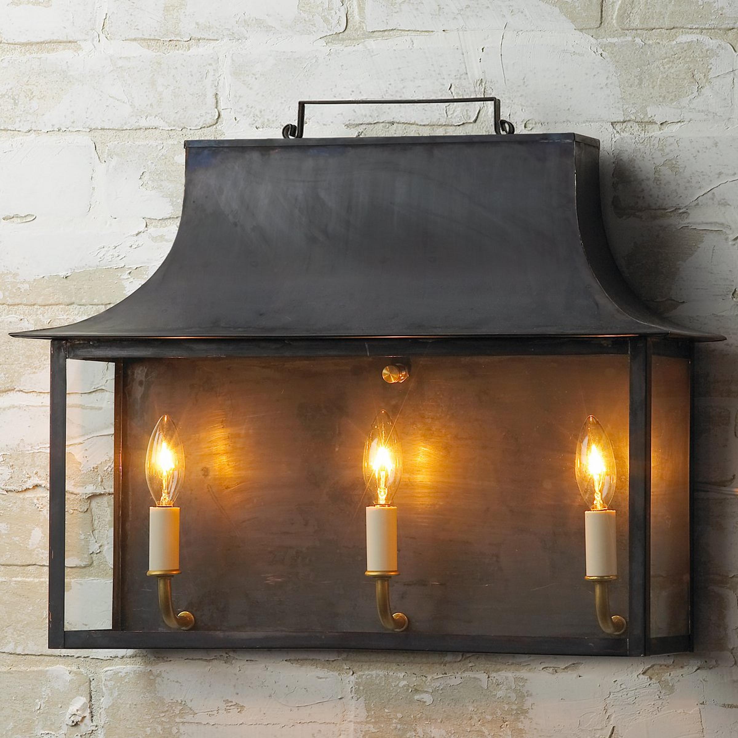 Handcrafted in Richmond, Virginia by our team of local artisans, this exclusive outdoor garage door light has design roots in the sprawling English countryside. The perfect solution for traditional homes, this handsome artisan light fixture includes 3 lights enclosed in a glass and copper or brass frame. Made to order so your home can boast a truly unique outdoor light fixture. Copper and brass are living metals that will change and patina over time, the color and speed of which varies based on environmental factors. Please note: Fixtures accumulating salt in coastal environments must be rinsed regularly to prevent corrosion. Items listed with Clear Coat are finished with a protective clear coating that may help to slow the natural patina of the copper or brass. This can be helpful in preserving the current look of the product, or as a protection against harsh environments.