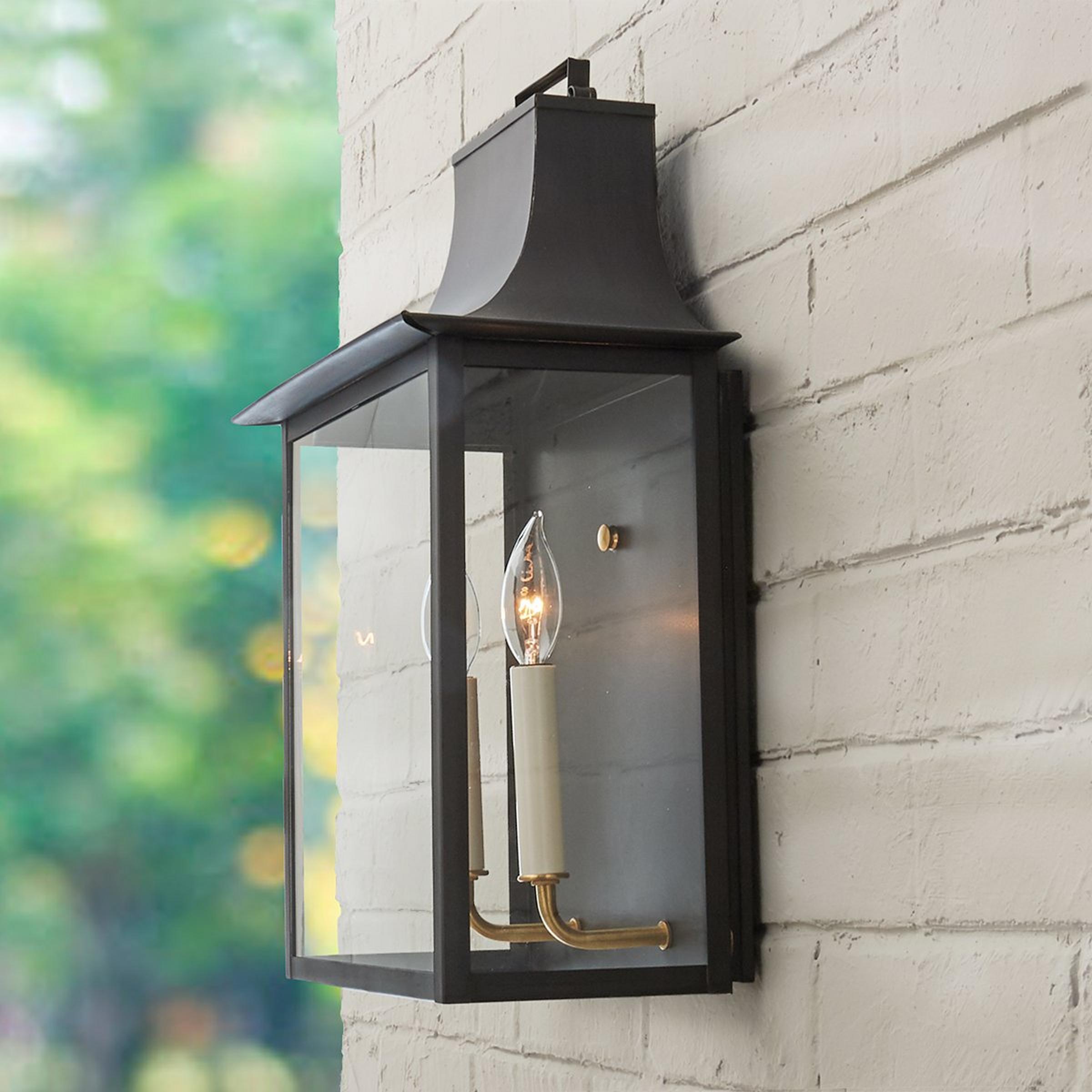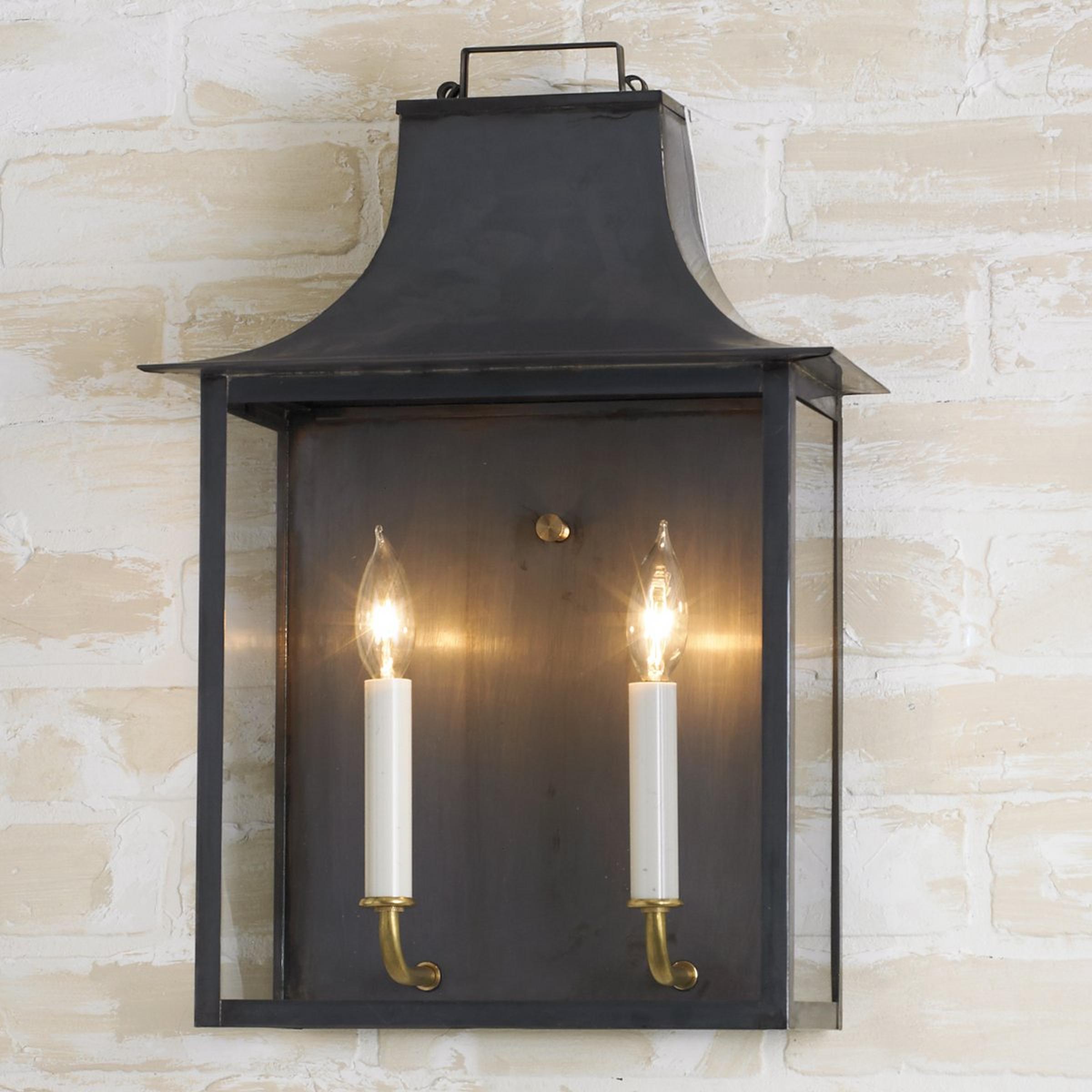 Handcrafted in Richmond, Virginia by our team of local artisans, this exclusive outdoor wall light has design roots in the sprawling English countryside. The perfect solution for traditional homes, this handsome artisan light fixture includes 2 lights enclosed in a glass and copper frame. Made to order so your home can boast a truly unique outdoor light fixture. Copper and brass are living metals that will change and patina over time, the color and speed of which varies based on environmental factors. Please note: Fixtures accumulating salt in coastal environments must be rinsed regularly to prevent corrosion. Items listed with Clear Coat are finished with a protective clear coating that may help to slow the natural patina of the copper or brass. This can be helpful in preserving the current look of the product, or as a protection against harsh environments.