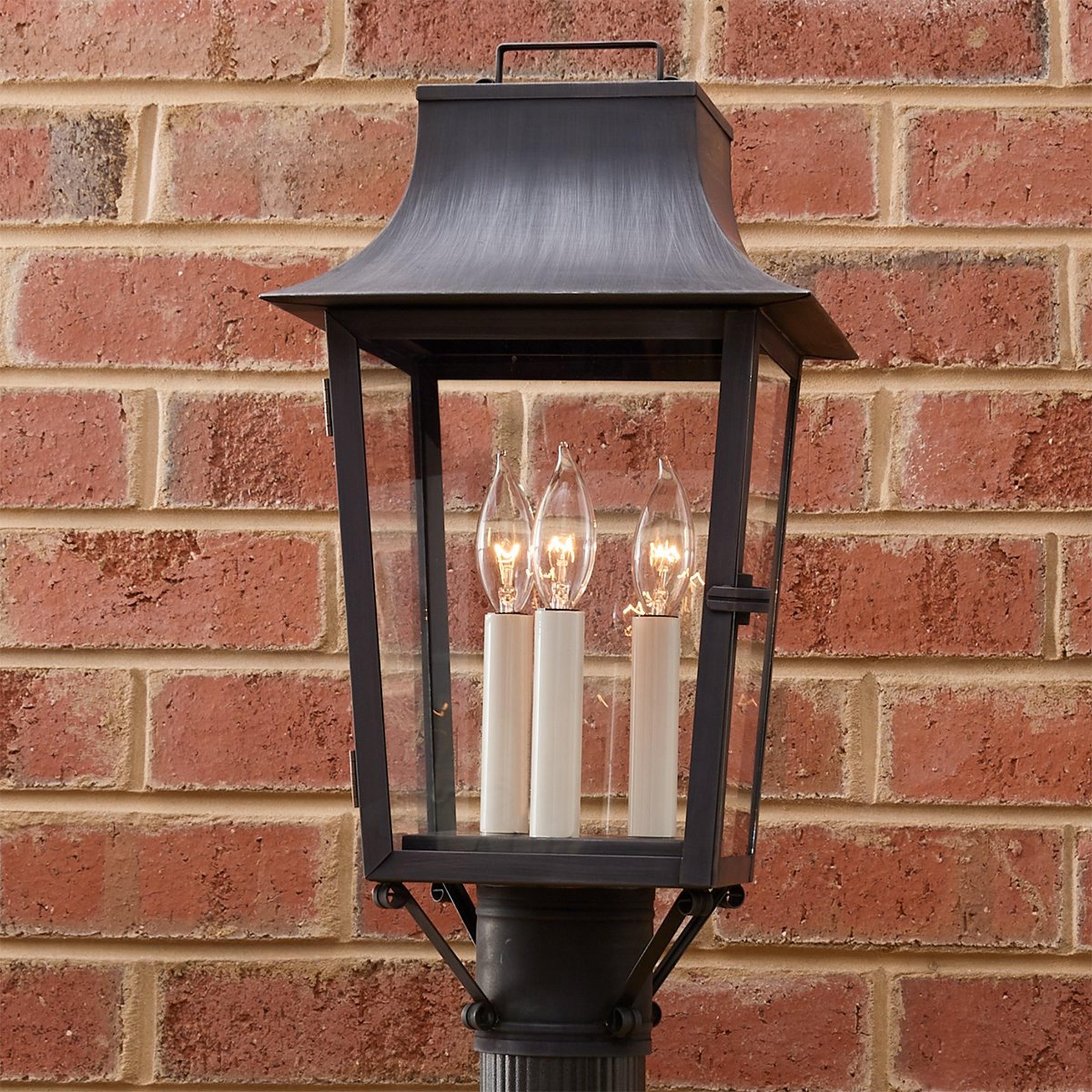 Handcrafted in Richmond, Virginia by our team of local artisans, this exclusive tapered outdoor post light has design roots reminiscent of fixtures seen in sprawling English countryside estates. The perfect landscape post lighting solution for traditional homes, this handsome artisan light fixture includes 3 lights that are enclosed with glass and a copper or brass frame. 3" post opening. Made to order so your home can boast a truly unique outdoor light fixture. Copper and brass are living metals that will change and patina over time, the color and speed of which varies based on environmental factors. Please note: Fixtures accumulating salt in coastal environments must be rinsed regularly to prevent corrosion. Items listed with Clear Coat are finished with a protective clear coating that may help to slow the natural patina of the copper or brass. This can be helpful in preserving the current look of the product, or as a protection against harsh environments.